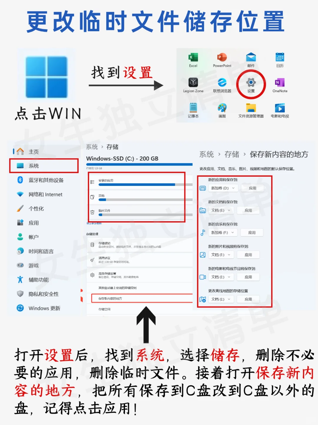 ➡️打开 设置后,找到➡️系统 ,选择➡️储存 ,删除不必要的应用,删除临时文件。✔️接着打开➡️保存新内容的地方 ,把所有保存到C盘改到C盘以外的盘,记得点击应用!