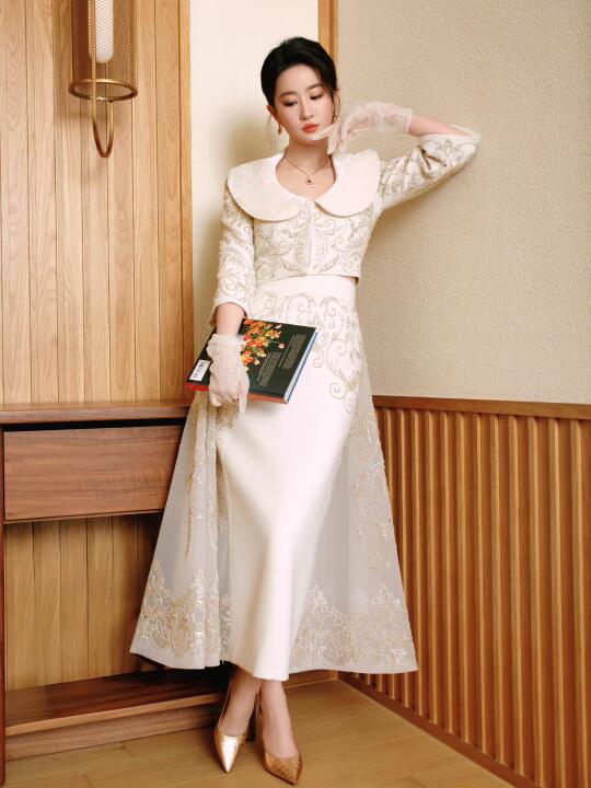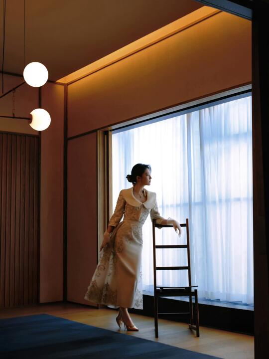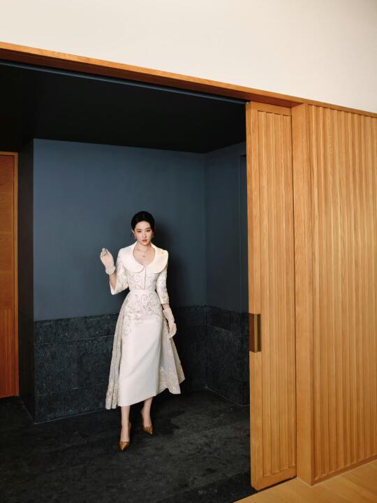 亦菲这一身好美!她有种安静、沉着、专注的气场。这身穿搭也适合职场,maxi长裙,裙子色彩低饱和度,剪裁有设计感,配饰不多但件件精致,项链和耳环设计精巧,衬托了姣好的面庞,这种美,如菩提树下微风静静吹过。白色通常象征清净和觉悟,“花开见佛”,是到了一定的境界,纷繁世间自有安宁,顿悟只在一瞬。花朵盛开时,喧嚣渐隐,亦菲的眉目,停泊着未语的禅。
