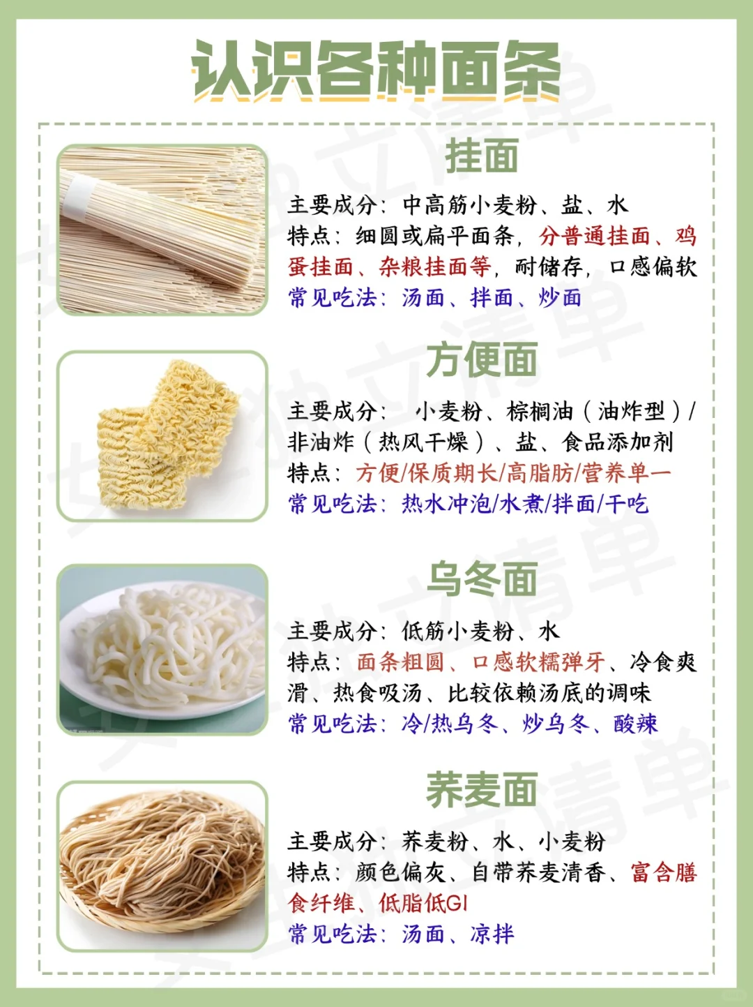✨谷物类:小麦面(拉面、挂面)、米粉(米线、河粉)、杂粮面(荞麦面、玉米面)