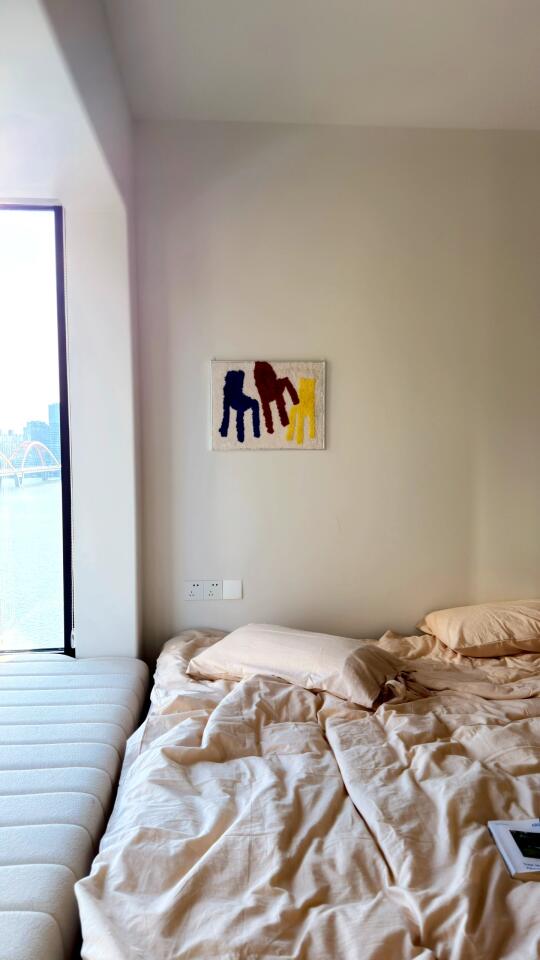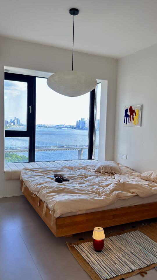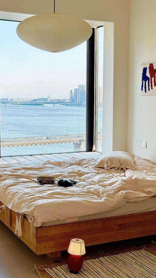 嘿~每天从这样的房间醒来~[蓝色心形R] 感觉每一天都没有被虚度[哇R] 最近换了无头床 [氛围感R] 和🪟窗台齐平 躺在床上 看外面的江面 [棒R] 就像睡在海边🌊一样 在小小长沙也能拥有海景卧室喔[亲一个R]