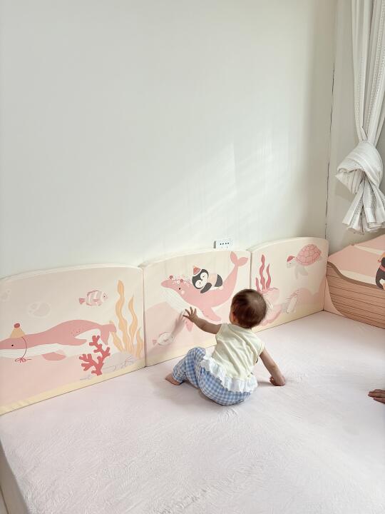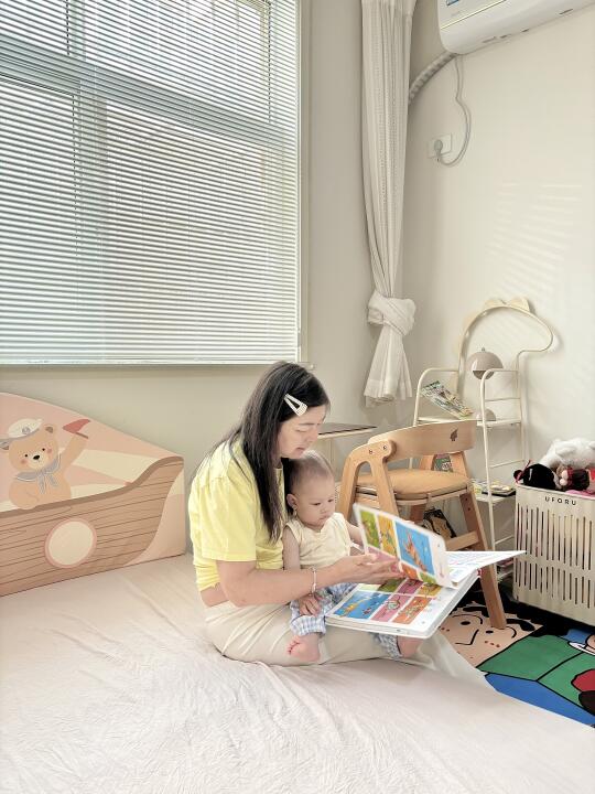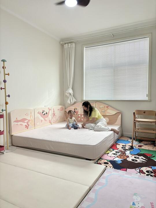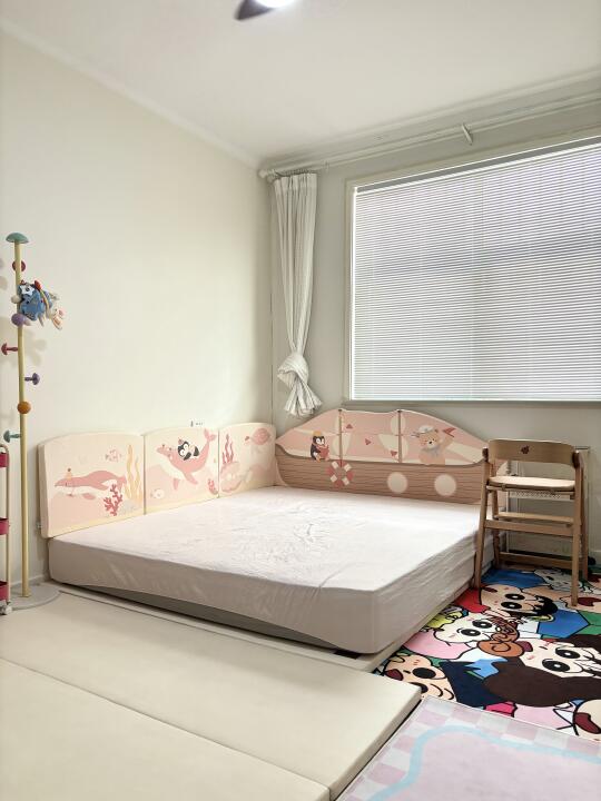 给丑丑的窗户🪟装了百叶帘 不用一直拉着纱帘 整体亮堂多了 接下来还准备在窗框装屋檐彩旗 床垫直接靠墙容易碰头 床头和床侧装了床围 不会再碰头了 整理出了阅读角 小恐龙书架和小A成长椅 能从小用到大的神仙搭配 灰色地砖真的冷冰冰且没有美感 不舍得买地毯 把家里的小新先拉出来用了 下一步计划 狠狠心换木地板/爬爬垫/地毯