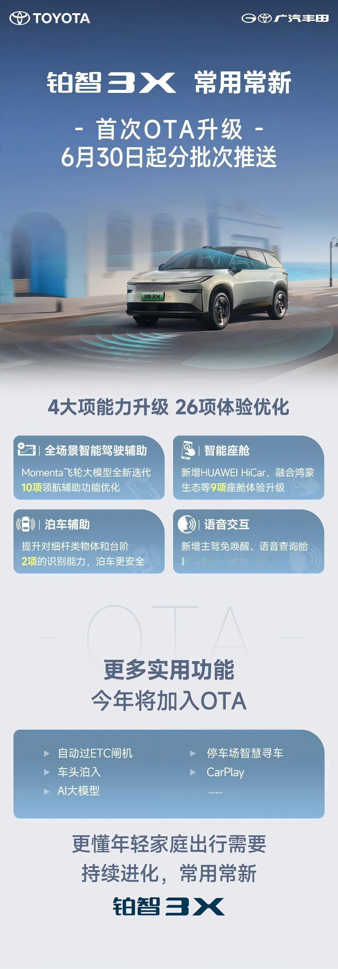 26项升级!铂智3X首秀OTA展现“合资新势力”硬实力 “常用常新”不再是新势力专属!广汽丰田铂智3X上市三个月即火速推送首次OTA,以硬核实力刷新行业认知。更震撼的是,这“第一课”就诚意爆棚——单次更新便豪掷26项功能优化与新增,功能覆盖之广、数量之多,足以媲美一线新势力水准。 从智能座舱到智能驾驶,铂智3X的首次OTA处处体现用户关怀:HUAWEI Hicar无缝互联、全时免唤醒让主驾指令随心而发、非主驾音区可控,让交互更便捷;同时,多达10项的智能驾驶辅助精细打磨,如优化横向避让、跟车响应,让驾驶更安全、更“类人”。 尤为可贵的是,这仅仅是序章!年内铂智3X还将迎来多次OTA升级,确保用户的爱车持续进化。凭借如此高频、高质的更新能力,铂智3X成功拉开技术代差,坐实了合资新能源第一车的标杆地位!