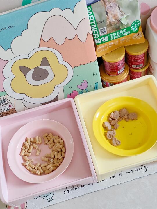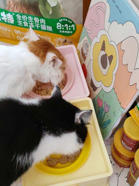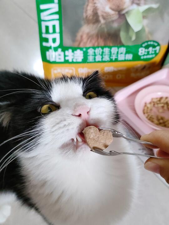 我家三只小猫都是捡来的,从不大点开始摸索着喂养,到现在只能说基本能摸清它们的口味了,也经常踩雷哈哈!买到他们三个都喜欢吃的,比 我自己吃到好吃的更开心!冻干弗列加特家里三小只都喜欢,最近天热想换换口味又买了帕特小鲜包,也是独立包装的,我喜欢独立包装,随手拿一袋喂很方便。冻干是小小的爱心型状,兔肉+鸡肉配方酥酥的,直接喂或者放猫粮里,罐罐上面,夏天小猫咪食欲不好,多放几颗冻干,能增加食欲。家里有挑食怪的可以试试!