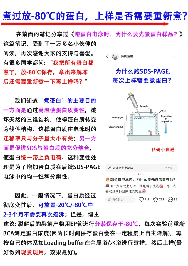 Hi~大家晚上好呀!我是科研废物[飞吻R],是一名喜欢分享科研原理的博主[猪头R] [打卡R]在进行蛋白电泳实验🧪时,我们通常先把蛋白样品高温煮沸5-10min,然后再去上样,那么煮完的蛋白来不及跑电泳放-20或-80度后,再次上样前,还需要重新煮吗?[举手R] 本期主要从以下两个方面进行分享 1️⃣煮蛋白的目的 2️⃣什么情况下需要再次煮蛋白? 满满的干货,欢迎大家👍收藏,一起讨论交流呀