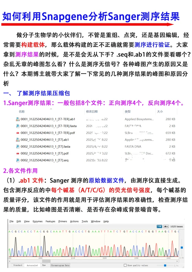Hi~大家晚上好呀!我是科研废物[飞吻R],是一名喜欢分享科研原理的博主[猪头R] [打卡R] 大家拿到测序结果的时候,是不是会无从下手?.seq和.ab1的文件要看哪个?杂乱无章的峰图怎么看?什么是测序无信号?各种峰图产生的原因又是什么[举手R] 本期博主就带大家了解一下常见的几种测序结果的峰图和原因分析[蹲后续H] [向右R]主要从以下三个方面进行分享 1️⃣了解测序结果压缩包 2️⃣详细分析测序结果 3️⃣拼接 满满的干货,欢迎大家👍收藏,一起讨论交流呀