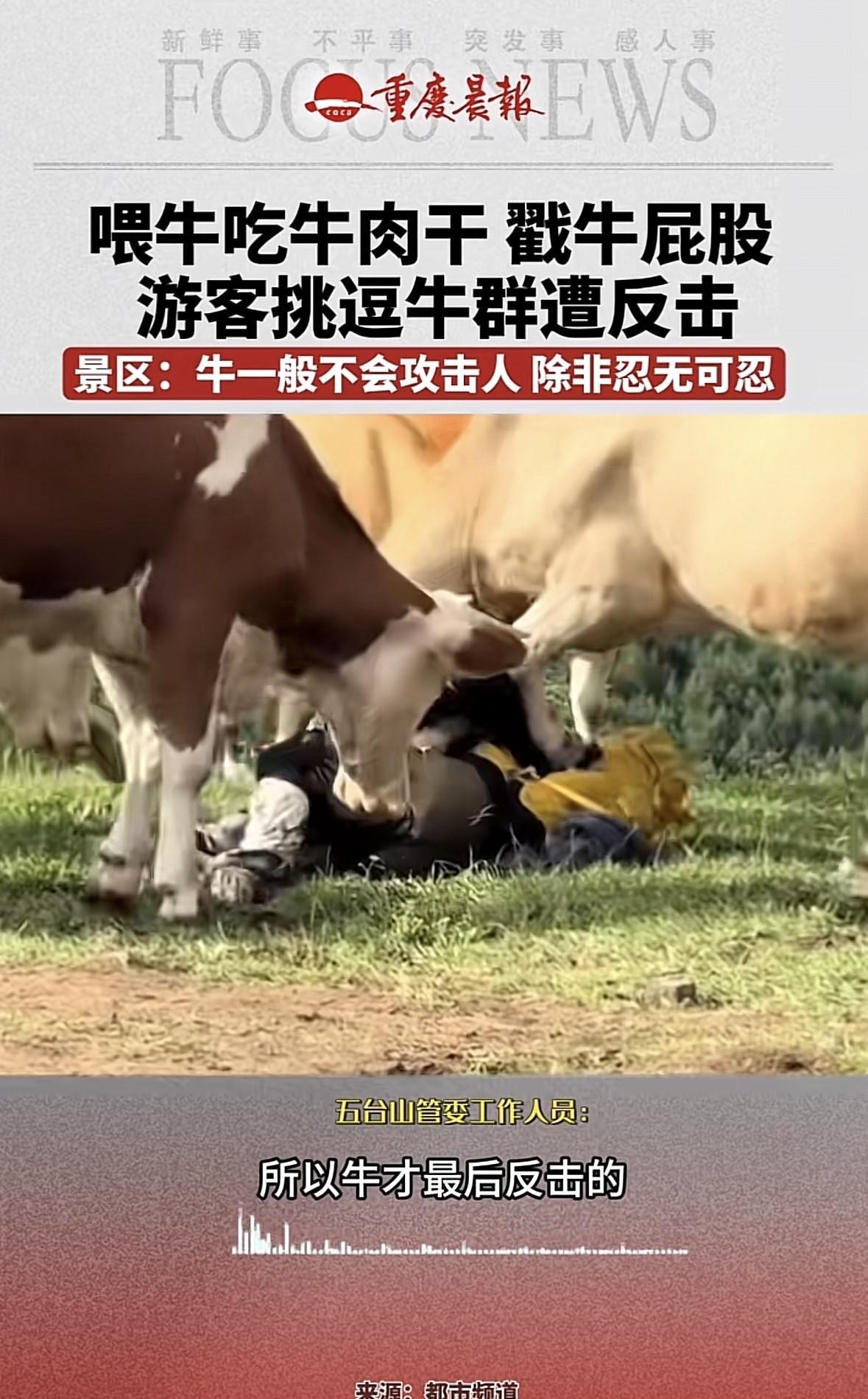 山西忻州,一男游客在景区游玩时,看见一群牛,他想恶 搞一下,就掏出一包牛肉干喂牛嘴里,还用登山杆不停戳打牛的屁 股,没想到,牛被男子的行为彻底激怒,一群牛围上来把他踩在脚下攻击他。工作人员回应,牛一般不攻击人,除非忍无可忍,这属于素养问题。网友:自作自受,不值得同情! 7月18号,重庆晨报报道,最近,网上流传着一段视频,说是五台山有游客被好几头牛给围攻踩踏了。 这消息一出来,可把不少打算去五台山游玩的人给吓住了,大家心里都纳闷,这好好的牛,咋就突然攻击人了呢? 17号那天,工作人员出来回应了这件事。 原来啊,这事儿还真不是牛无缘无故发疯。工作人员说,当时有游客干了两件特别不妥的事儿。 先是有游客拿牛肉干去喂牛。这牛肉干是啥?那可是牛的同类制成的食物啊。 你想想,牛平时吃草吃惯了,突然闻到自己同类的味道,得是个啥心情?代入一下,那不得吓一大跳,心里直发毛啊? 这牛闻到牛肉干的味道,估计也犯懵,不知道这游客到底想干啥,情绪上肯定就有些不稳定了。 紧接着,还有游客干了一件更过分的事儿。 他们拿着登山杆,一直不停地敲打牛的屁 股,是它能随便让人敲打的地方吗? 牛本来好好地在山上待着,突然不是被喂牛肉干就是被敲打的,肯定觉得被冒犯了,心里那股子火噌地就上来了。 于是,牛彻底被惹恼,开始了反击,好几头牛一起朝着游客围了过去,有的还踩了上去。 事后,工作人员还提到,这些牛常年在山上待着,一般情况下是不会攻击人的。这次的事儿,完全就是游客事先挑 逗在先,属于个人道德素养的问题。 有人说,昨天看了别人发的完整一些的视频,至少2人去惹牛,一个穿短裤的,一个长裤,拿登山杆多次打牛屁 股,强行坐在牛身上,把牛肉干塞牛嘴里,行为挺恶劣的,牛忍无可忍了,才攻击他的。 牛是比较温顺的动物,能让牛主动攻击你的原因就是红色的衣服或者不正当的挑衅。 同时,牛也是有灵性的动物,做农村长大的人个个都知道,天天要它梨田都不造反,农民也对它好,割草,杂粮,天冷时要烧热水绐它喝,都把牛当家里一组员对待。 也有人说,牛是草食性动物,当有人递来牛肉干这种它可能陌生甚至不符合其饮食习惯的东西时,它可能会因为好奇、紧张等情绪而出现过激反应。 那么,从法律角度,该怎么看待游客的行为?景区是否需要对这件事负责? 在这起事件中,游客存在拿牛肉干喂牛、用登山杆敲打牛屁股、强行坐在牛身上等恶劣行为。这些行为在法律上可能涉及对动物的不当侵害以及扰乱公共秩序等问题。 《治安管理处罚法》第23条规定:有下列行为之一的,处警告或者二百元以下罚款;情节较重的,处五日以上十日以下拘留,可以并处五百元以下罚款:扰乱车站、港口、码头、机场、商场、公园、展览馆或者其他公共场所秩序的; 五台山属于公共场所,游客的挑 逗行为引发牛的攻击,造成了现场秩序的混乱。 这种行为干扰了景区正常的游览秩序,影响了其他游客的安全和游览体验,符合扰乱公共场所秩序的情形。 虽然这个法条未直接提及对动物不当行为导致公共秩序混乱的情况,但游客行为产生的后果与扰乱公共场所秩序的特征相符。 如果情节较为严重,例如引发了大规模的恐慌或者造成了较为严重的后果,游客可能会受到警告、罚款甚至拘留的处罚。 此条法律通常用于规范动物饲养人或管理人的责任,但在该事件中可从反面理解游客行为的过错。 游客故意挑 逗牛,存在重大过失,其自身行为是引发牛攻击进而可能导致自身损害的主要原因。 如果游客因牛的攻击而受伤,从法律责任分担角度看,游客自身的故意挑 逗行为会成为减轻或免除动物潜在“饲养人”责任的重要依据。 游客不能仅因自己受伤就要求景区或其他可能的管理方承担全部责任,自身的不当行为需要承担相应的法律后果。 对于景区是否需要对这件事负责,不能一概而论。 一般情况下,如果景区已经尽到了合理的安全保障义务,例如在危险区域设置了明显的警示标识、对游客进行了必要的安全提示等,景区可能不需要承担主要责任。 但如果景区对存在安全隐患的动物管理存在疏忽,比如没有对牛的活动范围进行有效管控,或者没有及时制止游客的危险行为,那么景区可能需要承担一定的补充责任。 不过从此次事件来看,主要是游客的故意挑 逗行为引发,若景区已尽到常规管理义务,其责任相对较小。 这件事儿也提醒大家,去外面游玩的时候,一定要提升自己的道德素养,尊重动物,不要随意去逗它们。 动物也有自己的情绪和底线,咱们不能因为一时的好玩,就做出一些不恰当的行为。不然,最后吃亏的还是自己。 对于这起事件,你有什么看法?