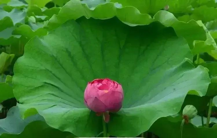 《咏荷》 一瓣静红破晓烟, 半含清露半含禅。 风来欲把禅心问, 却惹波间万叠圆。