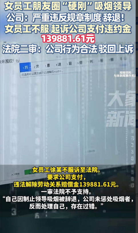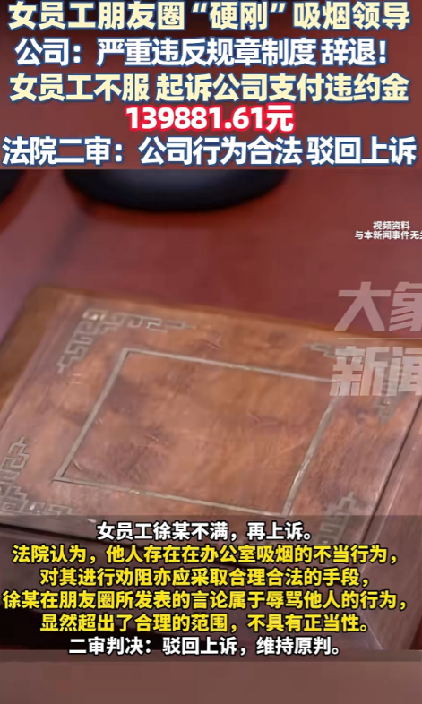 北京,女子因领导在办公室里抽烟,发朋友圈斥责:在办公室抽烟的人是傻*么?怎么还不去死……实名制诅咒你全家。事后公司以女子严重违反规章制度为由解除劳动合同。女子申请仲教要求支付赔偿金,仲裁未支持。女子不服起诉,索要违法解除合同赔偿金13万多元,一审败诉。女子又上诉,二审这样判决。