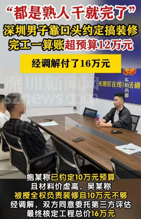 4月7日,广东深圳,男子有套300平的房子,委托给熟人装修,因为两人是朋友,开工前并没有商量预算,也没有签合同,给了9万元便直接开干。期间,所有装修事宜全都由熟人负责,男子并未过问,谁知,等房子装修好,熟人拿着预算单找男子结账时,他瞬间傻眼,实际费用竟然高达22万,远远超出他的预期。男子认为熟人在坑他,材料人工价格都偏高,而熟人解释:300平的房子,天王老子来了10万元也装不了呀!