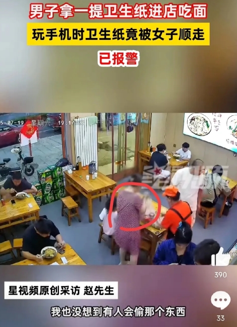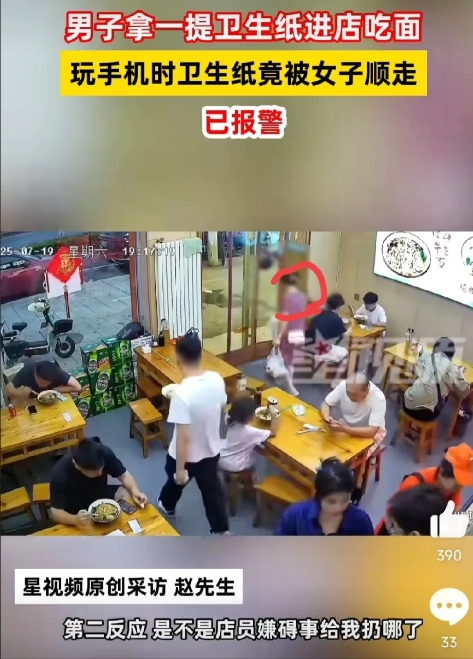 当他吃完面后发现,自己提来的卫生纸不见了。