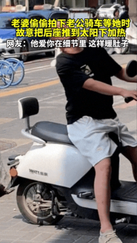 “聪明过头了!”河南一男子骑着电动车等妻子出来,不料他竟然趁妻子没出来的工夫,特意把电动车往后挪了挪,让太阳直直地照在电动车后座上,甚至还伸手摸了摸感受了一下温度,随后便露出了得意的笑容。万万没想到,他的一举一动全被在远处看着的妻子拍了下来!网友:“一看那表情就知道,他肯定想干什么坏事!” 据直播聊城7月20日报道:河南三伏天的下午,太阳晒得人发晕,路边树荫下,一位骑着电动车的男士在等妻子。 眼瞅着时间快到了,他做了一件挺有意思的事:先是左右张望了一下,确认妻子还没现身,然后双手扶稳车把,小心翼翼地把电动车往后倒了一小段。 这一倒,原本在阴凉里的后座,一下子挪到了明晃晃的太阳底下,他还不放心,伸手摸了摸车座,感觉烫手了,脸上忍不住露出一丝“得逞”的笑容。 他以为这“小动作”神不知鬼不觉,哪晓得整个过程,都被早到一步、藏在附近的妻子悄悄用手机拍了个正着。 这段视频后来传到了网上,没想到直接就火了起来,网友们看着乐,也各有各的看法。 有人直接笑他:“这家伙,真是‘聪明’过头了!想干点‘坏事’的时候,大太阳底下也不嫌麻烦。” 也有网友说:“他爱你在细节里,这样暖肚子,是怕老婆宫寒,是个贴心的男人!” 这件事不大,就是炎热街头夫妻间的一个小片段。它让人看到的,不是什么惊天动地的浪漫,而是中年夫妻过日子时特有的那份劲儿。 没有年轻人那种直白的甜言蜜语,更像是把关心藏在了日常的小动作里,有时候甚至会显得有点笨拙或者带点玩笑。 妻子能笑着拍下这一切,说明她看懂了丈夫挪座位背后那份朴实的惦记,两口子几十年的情分,往往就融化在这些柴米油盐、甚至有点让人哭笑不得的细节里。 这件事不张扬,却像树根一样扎得深、长得牢。日子久了,感情的表达或许少了花哨,但这种藏在“恶作剧”里的体贴,不正透着另一种实在的暖意吗? 各位朋友,你家里那位,是不是也做过这种让你又好气又好笑、细想又心头一暖的事儿? (信息来源:直播聊城《7月17日,河南。老婆偷偷拍下老公骑车等她时,故意把后座推到太阳下加热。》2025.07.20)