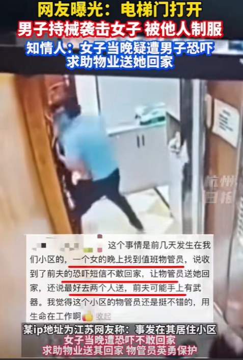 太惊险了!近日,江苏南京,一女子担心被报复,特地请求物业两人护送回家,谁知电梯门一开,一把斧头竟“呼”地砸了过来!那一瞬间,她甚至来不及尖叫。还好物业小哥反应神速,一个飞扑锁喉将歹徒死死按住——而此人,正是她那个家暴又出轨、被判净身出户的前夫。网友:这物业费交的值! 电梯门缓缓打开的一瞬间,李女士(化名)甚至来不及尖叫,挡在她面前的物业小哥已经和持斧男子搏斗起来,而那人,正是她那个离婚后仍纠缠不休的前夫。 这惊险的一幕就发生在2025年7月19日的江苏南京。李女士与前夫的婚姻早已破裂,法院判决离婚时,由于男方有家暴行为,最终被判“净身出户”。然而,前夫并未就此罢休,反而变本加厉地骚扰她,甚至多次发短信威胁:“你不让我好过,我也不会放过你!” 恐惧之下,李女士只好向小区物业求助,物业出于安全考虑,特意安排两名工作人员护送她回家。可谁都没想到,前夫竟早已埋伏在电梯口,伺机报复。 据监控显示,那天,神色紧张的李女士在两名物业人员的陪同下进入电梯,电梯到达后,门刚打开一条缝,一把斧头便狠狠劈下。好在站在前面的物业小哥张勇(化名)反应极快,及时躲过去了。接着,张勇便跟另一名物业人员一起,将男子制服了。虽然整个搏斗过程不过十几秒,却十分凶险。 男子被按在地上后,仍然在不停挣扎叫骂,声称前妻“毁了他的生活”。而惊魂未定的李女士站在一旁,半天都说不出一句话。 对此,许多网友都感叹:“要不是物业小哥反应快,又是一桩悲剧。” 其实,李女士的遭遇并非个例。近年来,离婚后报复前任的案件屡见不鲜,尤其是存在家暴史的婚姻,分手后往往伴随着更高的暴力风险。法律虽然能判决财产分割,却难以完全阻断偏执者的恶意。 所幸,李女士在事发前已经意识到危险,并主动寻求帮助,这才避免了惨剧的发生。物业人员的专业素养和临场反应,无疑成了她的“救命盾牌”。反观许多类似案例,受害者往往因求助无门或得不到重视,最终酿成无法挽回的后果。 目前,案件仍在进一步审理中。但李女士仍需面对漫长的心理恢复过程。这场电梯间的生死瞬间,不仅暴露了极端人格的可怕,也再次敲响了家庭暴力防治的警钟。 只能说,当爱变成恨,当亲密关系沦为暴力温床,除了让法律严惩施暴者,大家或许还需要更多的“张勇”们:那些在危急时刻敢于挺身而出的普通人,用勇气和行动守护了每一个无辜的生命。 信息来源: 杭州日报2025年7月20日|网友曝光电梯监控:男子持械在电梯门口袭击女子,被电梯内两人制服!知情人称具体情况以官方通报为准!