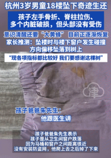 祖宗发力了!浙江杭州,一3岁男孩不慎从18楼跌落,送医后诊断出左手骨折和多个内脏破损等,但令所有人都没想的是,孩子最后却存活了下来,甚至意识清醒时,还要让爸爸买“大黄蜂”,如今正在恢复中,网友:老祖宗的关系够硬!