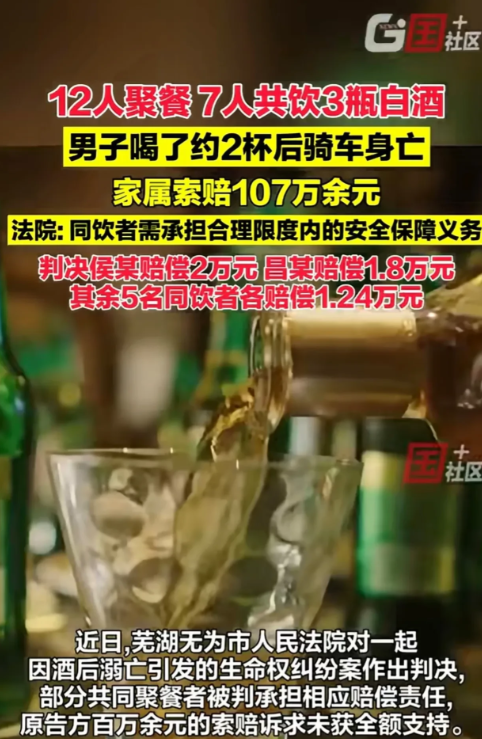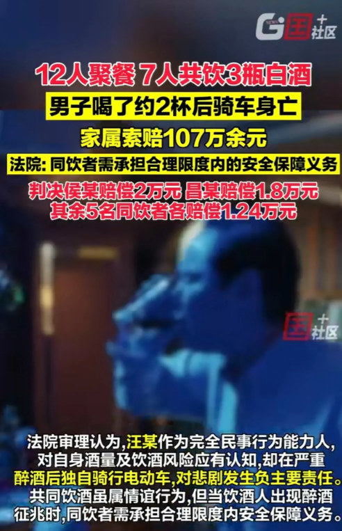 又是喝酒惹的祸!安徽芜湖,一男子参加朋友聚会,席间,7人喝下3瓶白酒,男子自饮两杯。不料事后,男子骑着电动车回家时,却不慎落入水塘溺亡。事后,男子的家属将当天其他11名聚餐者,及水塘所在地的村委会告上法院索赔107万元,法院这样判了! “好好的人去聚个餐,咋就没了!他们都有责任!” 王大哥(化名)的妻子既崩溃又愤怒的喊道。 据国+社区7月22日报道,2023年王大哥和自己11位朋友,来到家附近的一家餐馆聚餐。 朋友们相邀聚餐,是想借着这份热闹,拉近彼此的情谊,王大哥像往常一样,回到家里换了身衣服,就骑着家里的电动车来到餐馆。聚餐桌上,几位女生不喝酒,所以王大哥和7 个男人凑在一起喝起了白酒。 本来只是想少喝点,达到微醺的状态就回家,可是越聊越上头,在酒精的作用下,大家一瓶接着一瓶的开启,没过多久,七人竟然喝了三瓶白酒,王大哥他自饮了约两杯白酒,就感觉昏昏沉沉,有点多了。酒过几巡,聚会渐渐接近尾声,众人也各自准备散去。 王大哥没觉得自己喝得有多过量,而且这个地方离自家也近,想着骑电动车回家也不是啥难事,便跨上了车,朝着家的方向驶去。可谁都没料到,这场返程之路,会变成一条不归路。 王大哥在骑行途中,起初一切还好,身体能控制住车辆,可突然不知是因为饮酒后意识和反应受影响,还是路况等其他因素,他直接连人带车栽进了路边的大水塘里,因为时间太晚,再加上半夜很少有人路过此地。 等王大哥被发现时,他已然没了生命体征。好好的一个人,就因为这一场聚会然后一次酒后骑行,突然没了,王大哥家属们的天塌了。 沉浸在巨大悲痛中的家属,无法接受这样的现实,他们认为当天参与聚餐的其他人,还有水塘所在地的村委会,都要对王大哥的死亡负有责任。于是,家属一纸诉状将另外 11 名聚餐者和村委会告上了法院,索赔 107 万余元。 他们觉得,要是同饮者能多尽点心,不让他喝那么多,或者拦住醉酒的王大哥骑车,再不然把他送回去。还有要是村委会能把水塘周边防护做得更到位,或许悲剧就不会发生。 法院受理此案后,进行了细致的审理。首先看同饮者这一方,王大哥作为完全民事行为能力人,得对自己的酒量和1饮酒后可能产生的风险有清楚认知。可他在饮酒后,尤其是处于醉酒状态时,还独自骑电动车,这一行为本身就对悲剧发生负有主要责任 。 但话说回来,共同饮酒虽说算是朋友间的情谊行为,可当有人出现醉酒征兆时,同饮者其实是有合理限度内的安全保障义务的。像当天和王大哥一起喝酒的人,在看到他有醉酒状态后,有没有尽到照顾和扶助以及护送,或者通知其家人的义务? 有没有对他酒后骑车这种危险行为进行必要提醒或者劝阻?很可惜,这些该做的,他们没做到位,任由王大哥单独驾驶电动车离开,这就存在过失了。再看村委会,法院认为水塘本身并非是因管理不善直接导致王大哥溺亡,村委会在这件事上没有过错,所以不用承担责任。 最终,法院依据各方的过错情况作出判决。判决组织聚会的人赔偿 2 万元,另外一名赔偿 1.8 万元,其余 5 名同饮者各赔偿 1.24 万元 。家属索赔的 107 万余元,并没有全部得到支持,而是根据责任划分,让同饮者承担了相应的赔偿。 对于这件事,大家有什么想说的呢?欢迎在评论区分享。 信息来源:国+社区 报道于2025年7月22日
