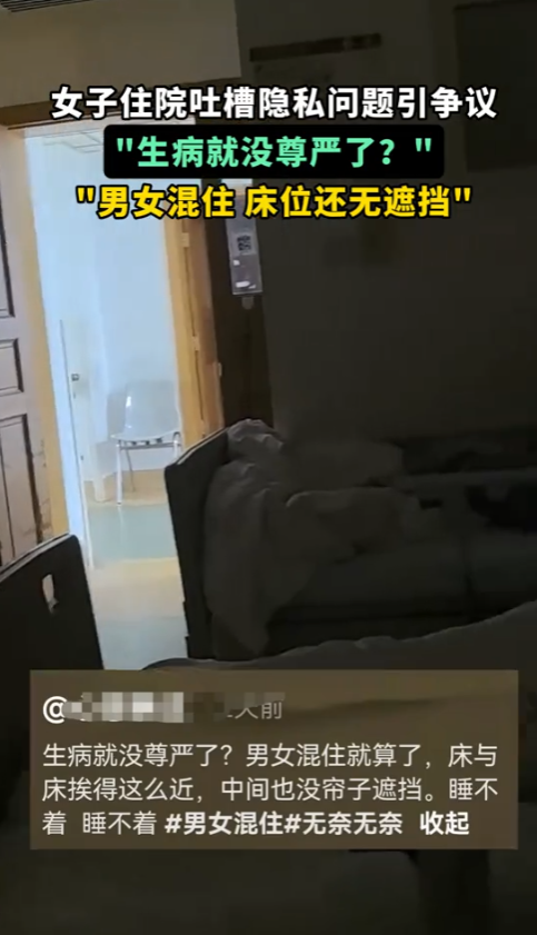 信息来源:《女子住院吐槽隐私问题“生病就没尊严了?”“男女混住还无遮挡”》搜狐新闻客户端