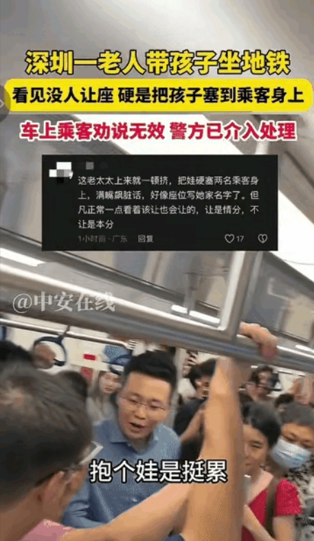 太过分了!深圳,一老太带着孩子乘坐地铁时,见无人让座,二话不说就直接把孩子塞到旁边一名女子身上,双方因此发生争执。
