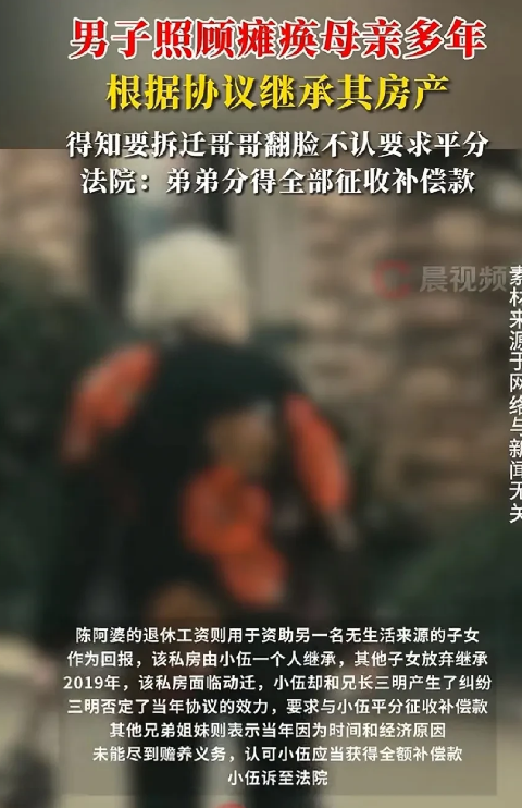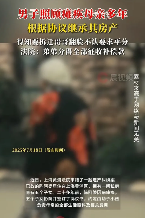 上海,男子精心伺候瘫痪母亲5年,母亲在的时候,兄妹5人签下协议,谁照顾老人,老人的一间私房归谁。20年后房子拆迁,男子拿到了补偿款。岂料,三哥眼红,跳出来要求平分。男子不同意:当初伺候老妈,你怎么不跳出来?三哥告上法庭,诉求当年的协议无效,法院判决亮了!