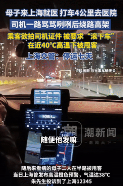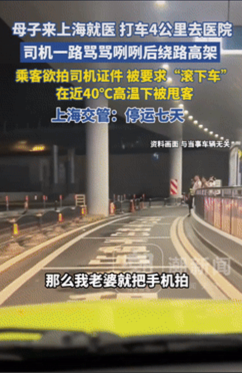 “赶紧给我滚下去,别耽误我赚钱!”司机恶狠狠的吼声在封闭的车厢里炸开,震得人耳膜发麻。而此刻,朱先生的妻子下意识搂紧了孩子,她怎么也想不到,自己带着孩子来上海看病,竟会在出租车上遭遇这样的羞辱。 据《潮新闻》报道,事情发生在2025年7月的一天。从杭州赶来的母子俩刚在上海南站坐上出租车,当她报出“复旦附属儿童医院”这个目的地后,司机的脸瞬间阴沉下来。 “就这么点路?你们不会坐地铁啊?”他嘴里骂骂咧咧的,一脚油门冲了出去,方向盘却猛地一打,直接拐上了高架。但这不是朱先生的妻子第一次去儿童医院,她对路线很熟,于是就问:“师傅,是不是走错了?医院应该不用上高架吧?”可司机却冷笑一声:“绕点路怎么了?你们这种短途客最烦人,耽误我接大单!” 车里的气氛越来越压抑,年幼的孩子被司机的怒吼吓得直往母亲怀里缩,而那位母亲只能强忍愤怒,试图用手机拍下司机的服务证投诉。 没想到这个动作彻底激怒了司机:“拍什么拍?不想坐就滚!”话音未落,出租车一个急刹停在了高架桥的应急车道上。还没等她反应过来,司机已经跳下车,随后粗暴地拉开后门:“下去!别逼我动手!” 将近40度的天气,高架桥上连个遮阳的地方都没有。朱先生的妻子只能牵着孩子站在滚烫的路边,看着出租车扬长而去,她的包里还装着孩子的病历和药,而原本只有四公里的路程,由于司机的绕路,导致她们母子现在离医院还有两公里远。 事件曝光后,不少网友都十分愤怒:“在高架桥上赶乘客下车,万一出事故算谁的?”也有人表示:“外地人来看病本就艰难,还要被本地司机欺负,上海的形象都被这些人毁了!” 更有人表示,就在前几天,虹桥火车站也有乘客因路程短被出租车司机辱骂;而在去年,浦东机场甚至有司机对老年乘客吼道:“短途不载,别碍事!” 究其原因,是因为部分司机觉得短途“不划算”,便开始挑客、拒载、甚至故意绕路,而乘客往往因急着赶路或者怕麻烦,被迫忍气吞声;最后,司机的违法成本太低,即便被曝光,往往都是停运几天草草了事。 只能说,当网约车平台用“服务分”和“一键投诉”倒逼司机规范行为时,传统出租车行业却仍在依赖“罚酒三杯”式的管理。可如果继续纵容少数人的恶劣行径,伤害的不仅是乘客,更是整个城市的声誉。 希望,当下一次,某位司机再对乘客吼出“滚下去”时,等待他的不再是7天的停运处罚,而是一张永久禁入行业的红牌。毕竟,一座城市的温度,从来不该由烈日下的眼泪来丈量。 信息来源: 潮新闻2025-07-23|母子来上海就医,打车4公里去医院,司机一路骂骂咧咧后绕路高架,在近40℃高温下让乘客“滚下车”。上海交管:停运七天