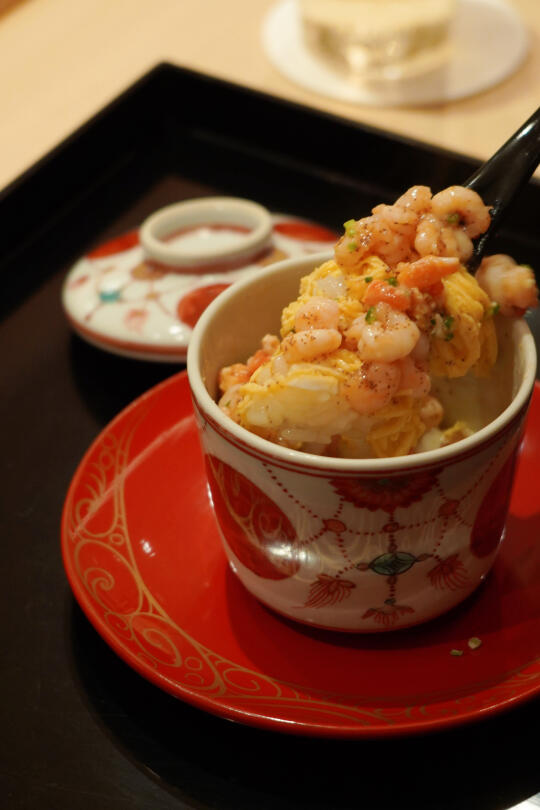 现剥虾锦丝蒸饭,虾仁的甜润混着鸡蛋丝,还有淡淡米香溢满口腔