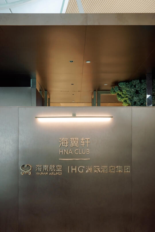 这次我搭乘的是公务舱,登机前自然少不了贵宾厅体验。以“花园绿洲” 为设计灵感的贵宾厅——海翼轩,融合了洲际酒店集团的典雅设计格调与海南航空 “梦之羽” 的视觉元素,一进来就能感受到满满的搭机仪式感。贵宾厅内的中堂,是酒店风格的“后花园” ,一棵翠绿的绿植伫立其中,我坐在绿荫下的沙发休息,旅途的疲惫感瞬间消减。