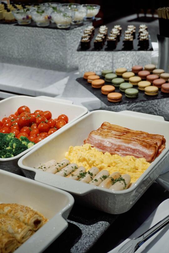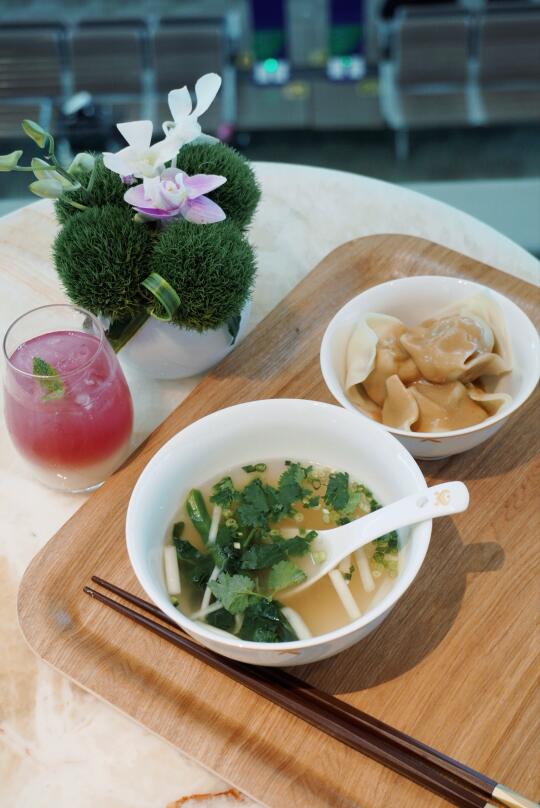 餐饮区的惊喜也不少,这里以洲际酒店集团高端餐饮品牌彩丰楼中餐厅 “彩丰十味” 菜单为灵感提供多样美食。我点了 “高汤馄饨”,搭配定制茶饮 “生椰白茶”,还没起飞,就提前享受到了星级酒店的美味。
