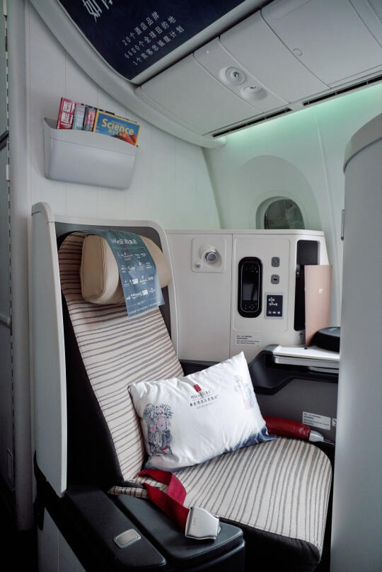 走进彩绘机的机舱,行李架上的推广贴纸,预示着这将是海航与洲际酒店集团的联袂演出。公务舱座椅还有与中国新水墨艺术家陈九合作的定制腰枕。联名合作的飞机餐点更是惊艳,不管是融合粤菜经典与海南风味的中餐“云飨·岛屿春粤”,还是结合炭火烹饪与本地食材的西餐“海旅炙趣,恰如其味” ,最后再喝上一口特调茶饮“华邑云香”,都带来了超棒的云端餐饮体验。