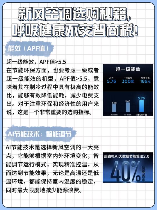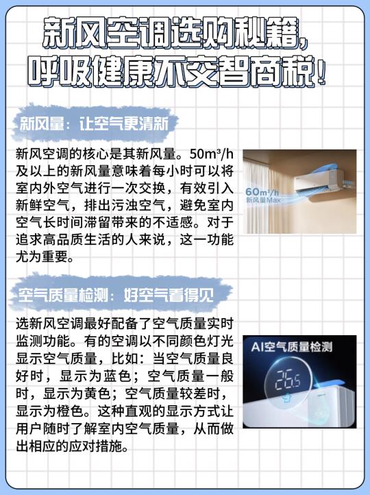 新风量:选新风量≥50m³/h的产品,面积越大需求越高。搭配空气质量监测,超标自动加大新风量。