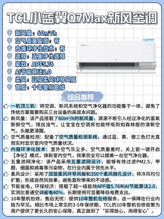空调 + 新风机 + 空气净化器三合一!算下来省了小一万,超一级能效还巨省电,除醛那几个月天天开,电费单居然没吓到我~ 10 年包修也让人踏实,毕竟甲醛要作妖十几年呢,有它盯着我放心!