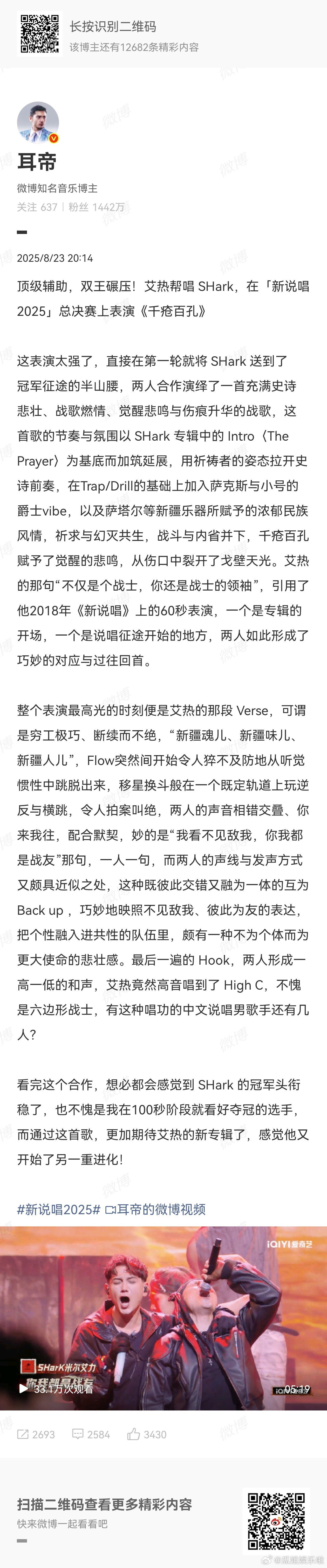 耳帝赞SHarK一开口冠军稳了新说唱2025 《千疮百孔》里的SHark真的让人眼前一亮,声音饱满且富有辨识度,与艾热的配合太和谐了,两个人的火花简直要炸裂,冠军这条路越来越近! ​​​