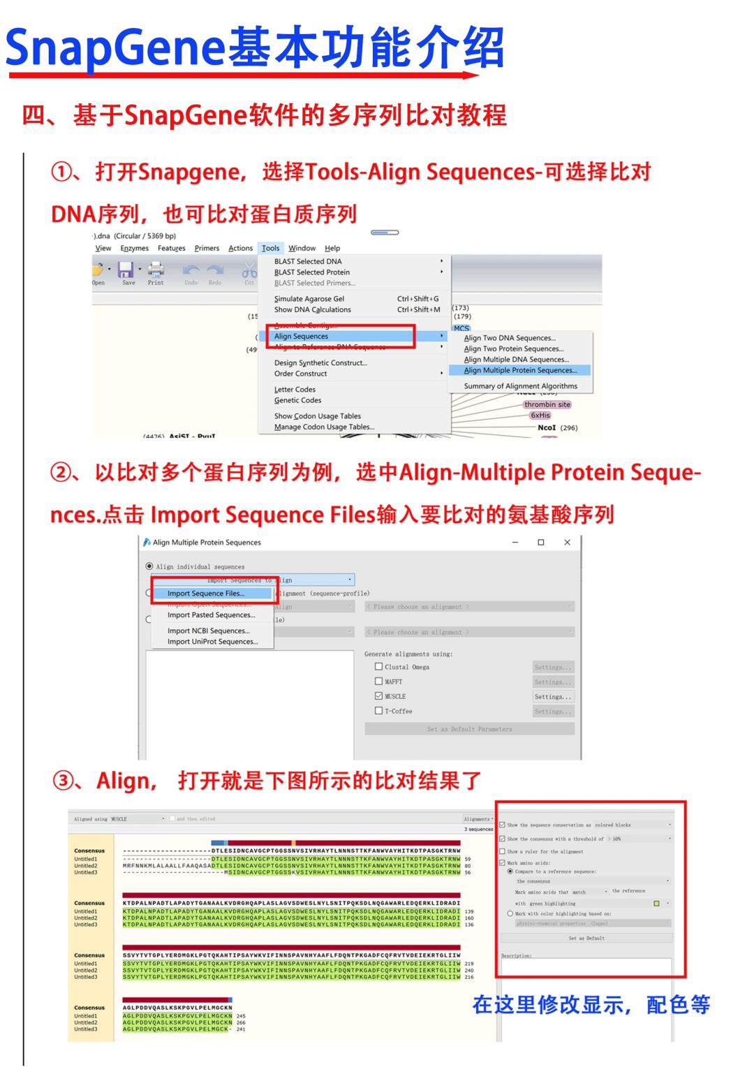 Hi-本期跟大家分享的是SnapGene软件使用教程 [氛围感R]SnapGene是一款综合性的分子生物学的软件,其包括的功能如PCR,酶切,质粒载体构建,电泳,序列比对等等,基本你用到的,这里都有 [向右R]主要从以下六个方面进行分享 1⃣️查看质粒图谱 2⃣️左侧功能按钮 3⃣️对片段进行注释 4⃣️多序列比对 5⃣️测序结果序列比对 6⃣️创建新DNA序列 满满的干货与tips ,欢迎大家👍收藏,一起讨论交流呀