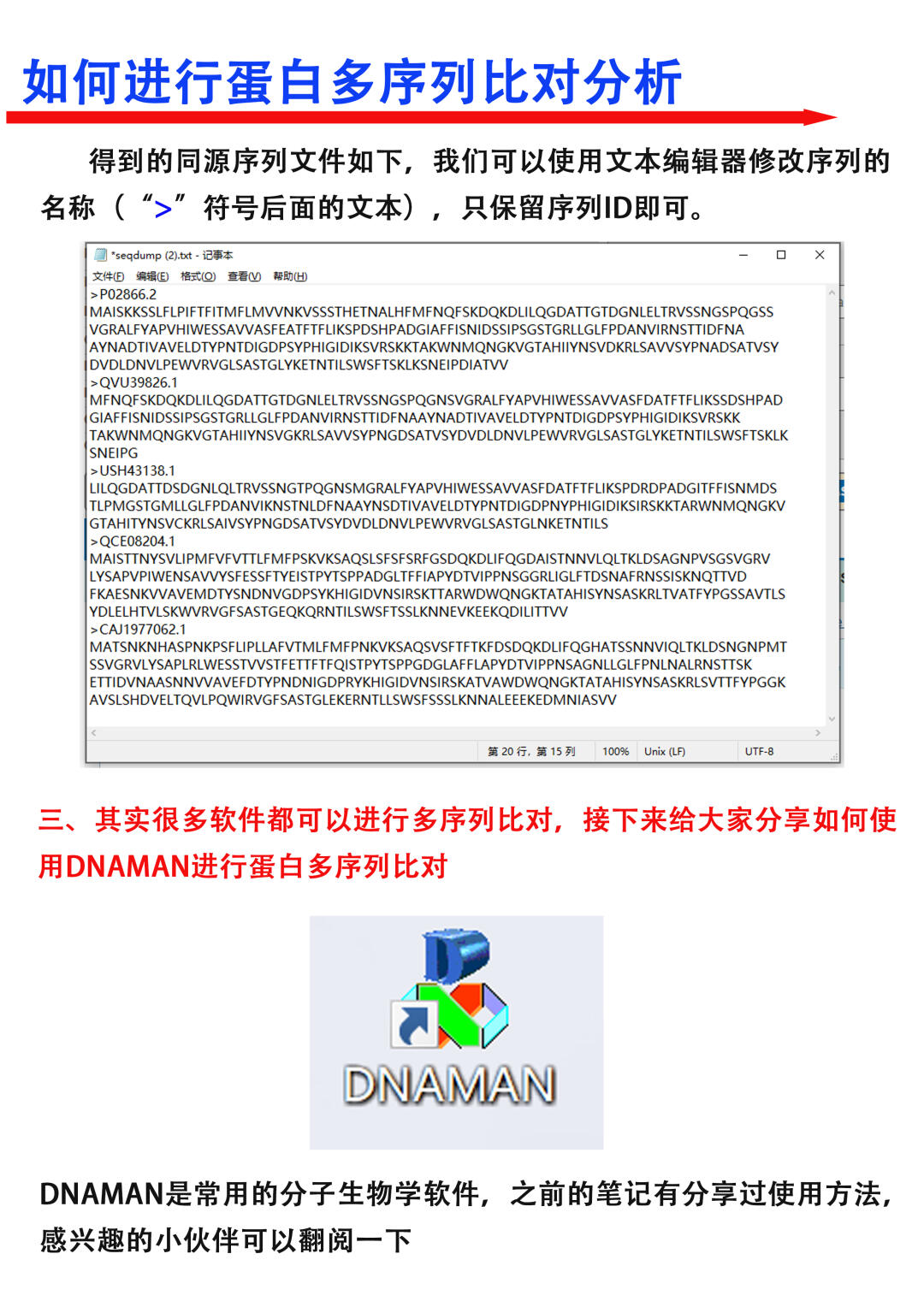 Hi~科研宝子们,大家晚上好[飞吻R],我是科研废物[猪头R] 本期跟大家分享一下如何绘制蛋白多序列比对分析图,教大家如何美化序列分析结果,作出高质量文章图[哇R] [向右R]主要从以下四个方面进行分享 1️⃣如何保存自己感兴趣的序列 2️⃣如何使用NCBI找到蛋白的同源序列 3️⃣如何使用DNAMAN进行蛋白多序列比对 4️⃣如何对比对结果进行美化分析 满满的干货与tips,欢迎大家👍收藏,一起讨论交流呀