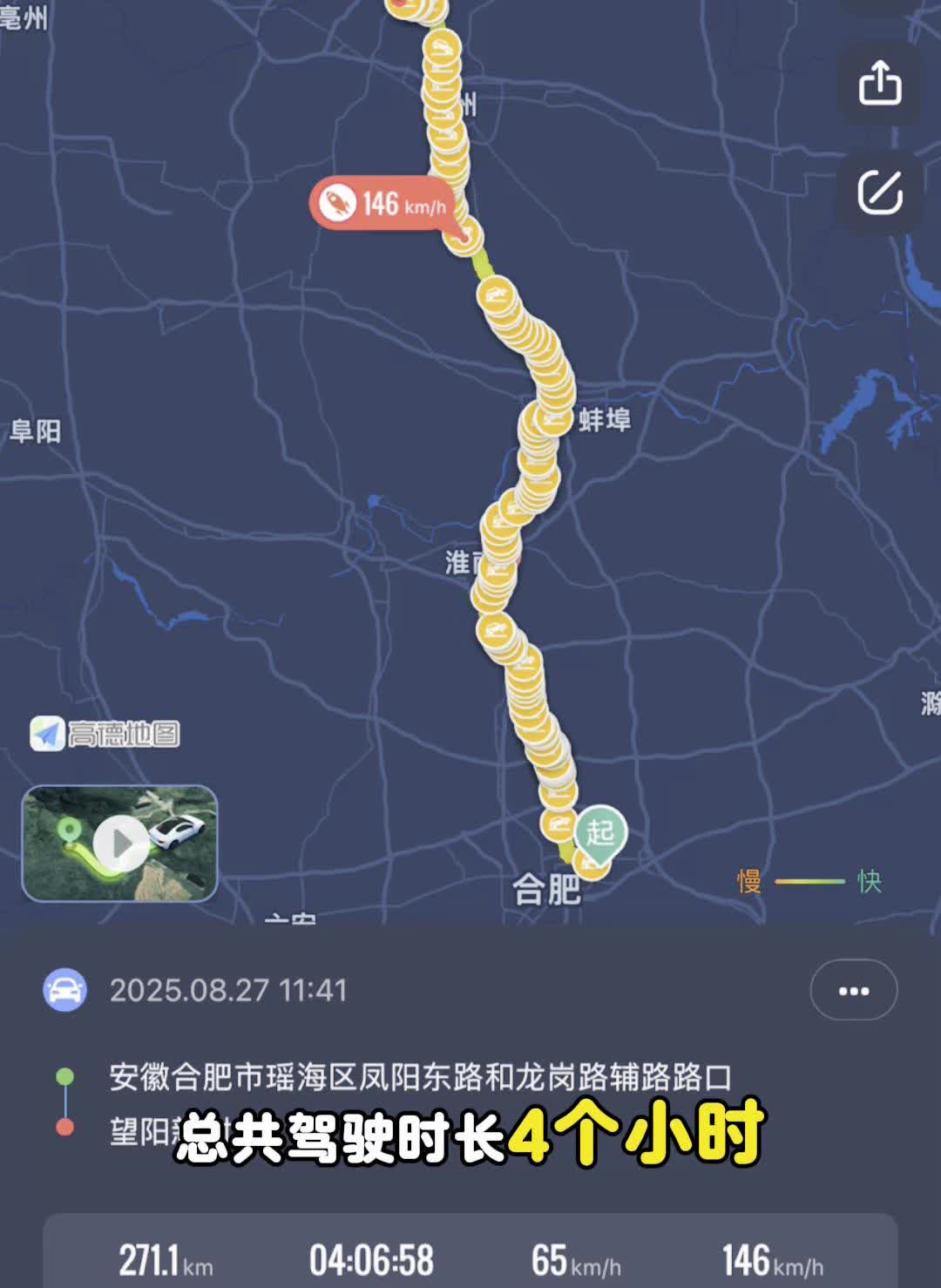 零跑C11续航测试。 从合肥直接开到淮北,总里程271.1公里,总共驾驶时长4个小时,平均速度是65,最快速度146。因为走的是省道加国道加高速,还剩动态续航131公里(出发455),标准续航还剩170公里(出发569),满打满算跑350多是没问题的。 大家的零跑C11平时跑高速、跑省道或者跑市区能跑多少?欢迎放在评论区一起交流一下,拜拜。