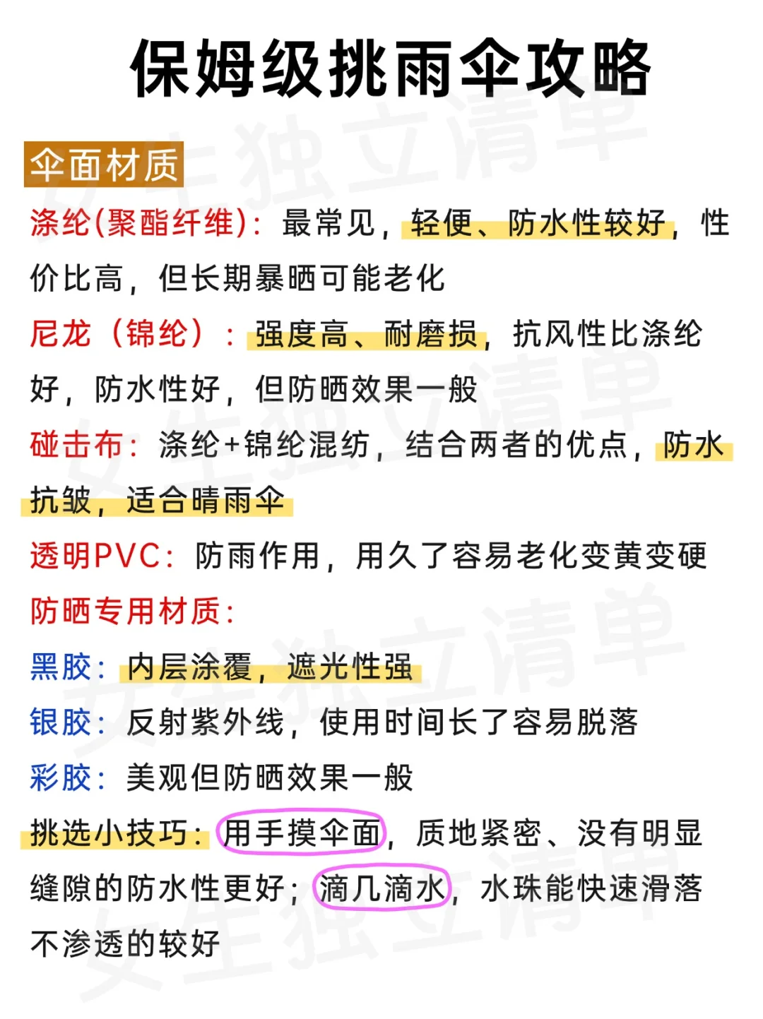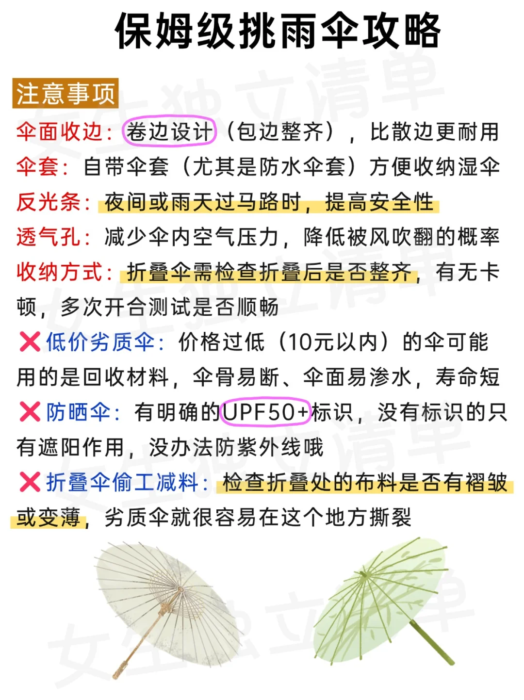 🌂防晒需认准UPF50+标识,优选黑胶/银胶材质、深色伞面