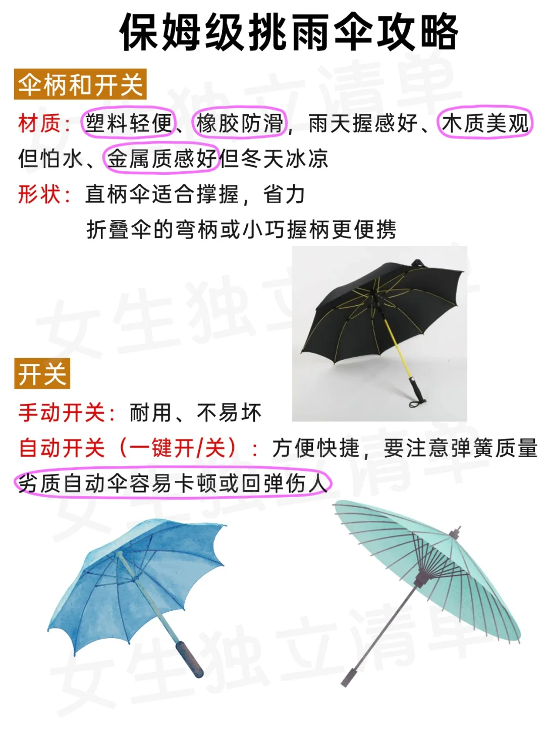 🔥伞柄选塑料轻便、橡胶防滑、木质美观怕水、金属质感好但冬天拿着手冷,直柄省力、折叠伞柄便携