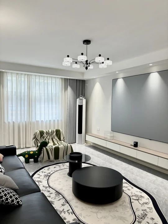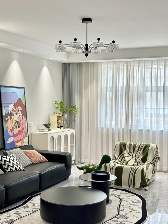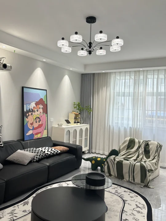 作为开间3.9米的垃圾户型还没钱的业主,看我怎么扭转乾坤,花小钱装大👃,就是轻硬装重软装,大大的幕布,黑酷的沙发,闪闪发光的水晶吊灯是标配,直接让家里提升几个b格~