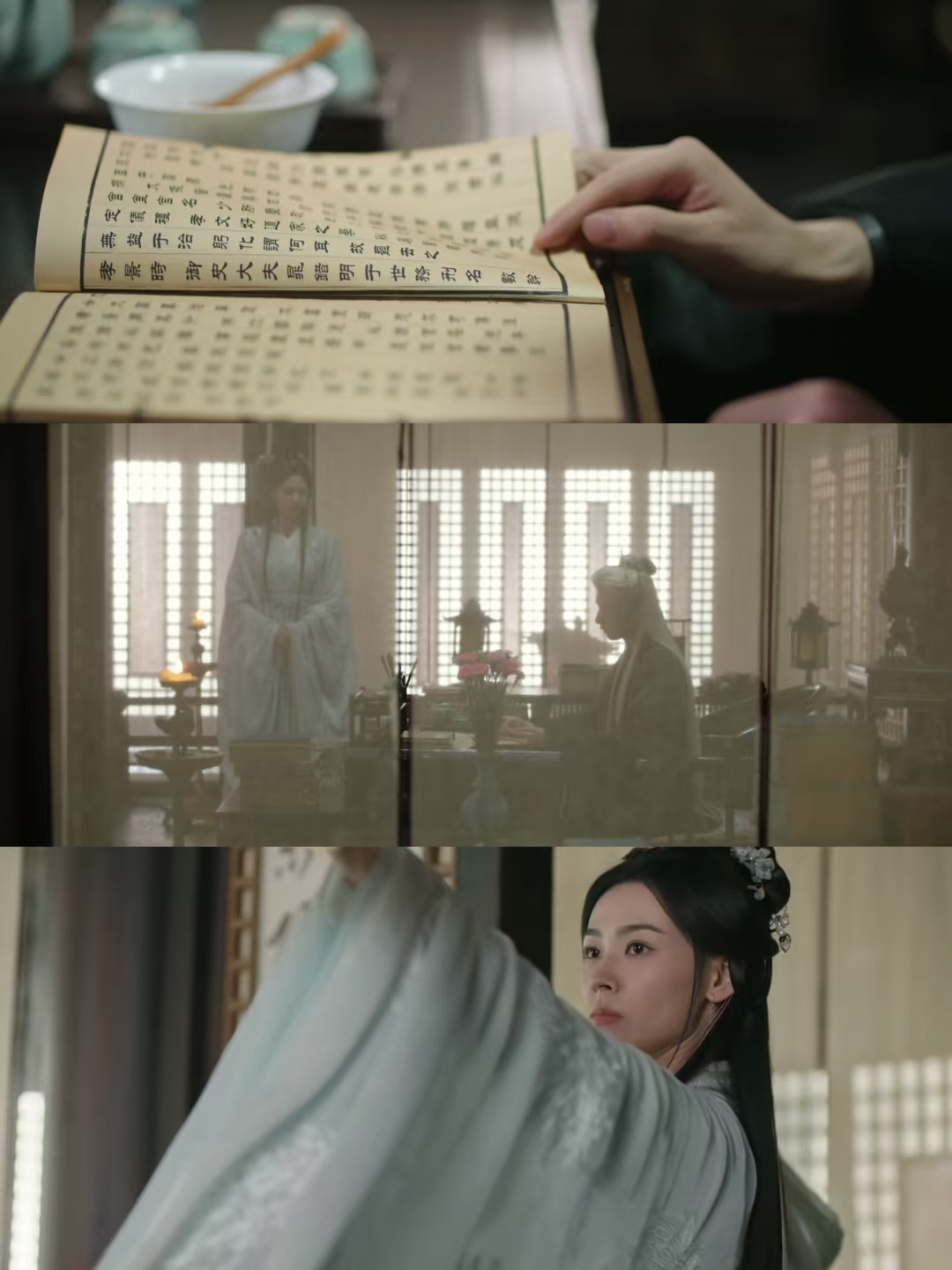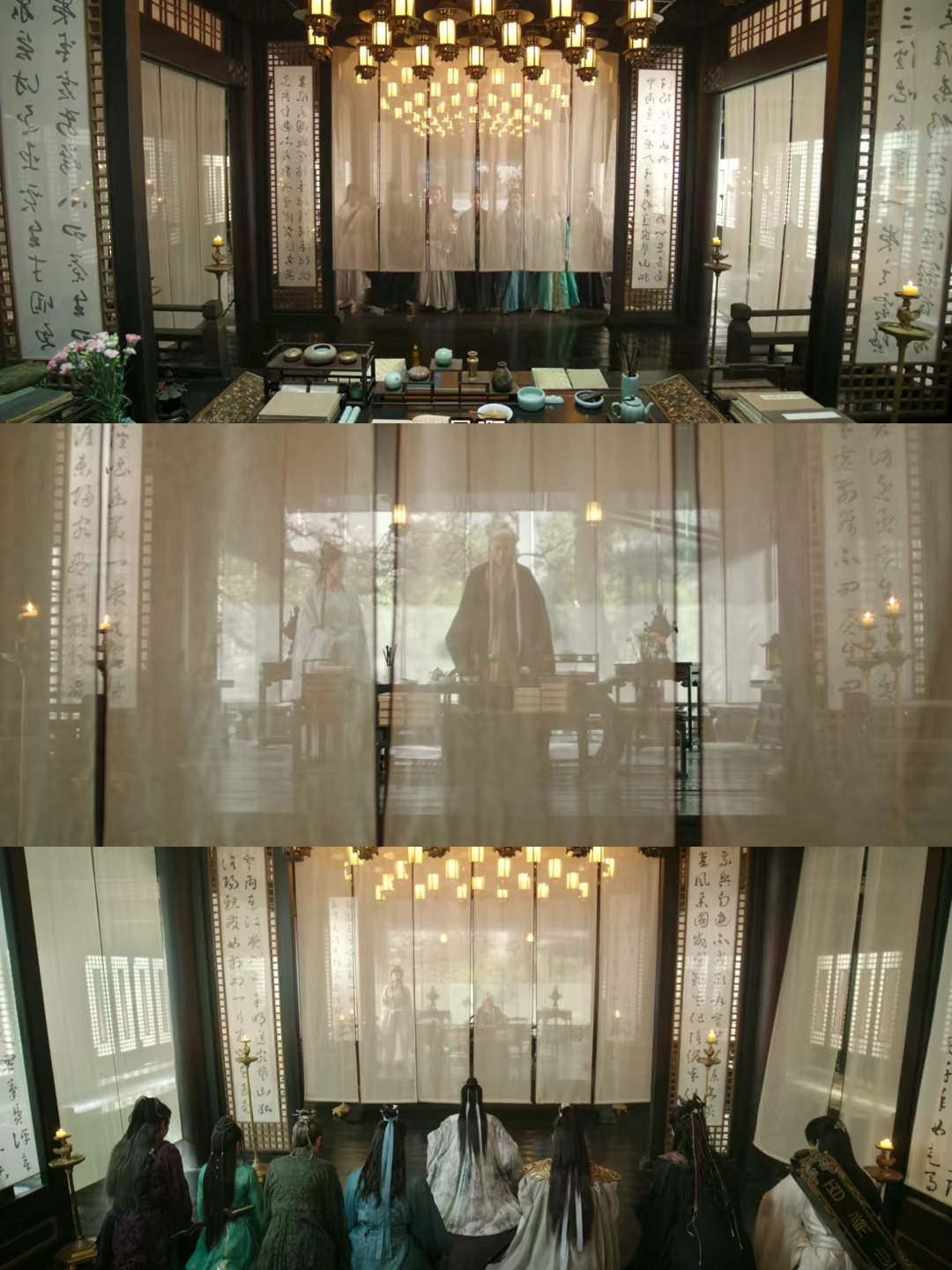 李沉舟和玄夜有着相似的霸气,但气质不太一样。玄夜霸气外露,李沉舟的气质既有动,也有静,静为主导,动为威慑,本质上也是一种权力感。李沉舟出场的时候,帘子被一股强风吹拂而起,修长的身影隐于帘后,坐下,轻翻书页。外面的人吵得激烈,他说话和缓,仿似没什么情绪。看完鞠秀山的信说鞠秀山自说自话,话锋一转又马上询问柳随风围攻剑庐的目的。他看似淡淡,却对属下的动静了如指掌,问的,说的,皆在关键之处。他俨然是位深沉莫测的掌权者,如一汪幽静的潭水,看不清深浅,想法难以揣测。