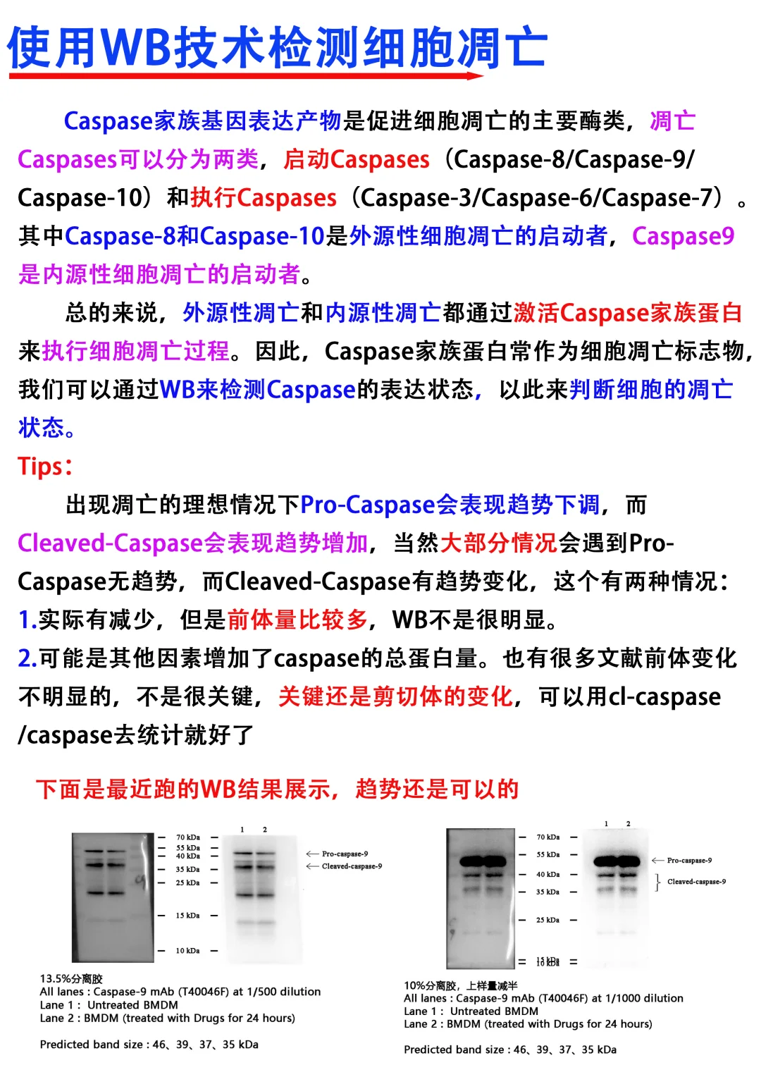 [蹲后续H] 外源性凋亡和内源性凋亡都通过j活Caspase家族蛋白来执行细胞凋亡过程。因此,Caspase家族蛋白常作为细胞凋亡标志物,我们可以通过wb来检测Caspase的表达状态,以此来判断细胞的凋亡状态。