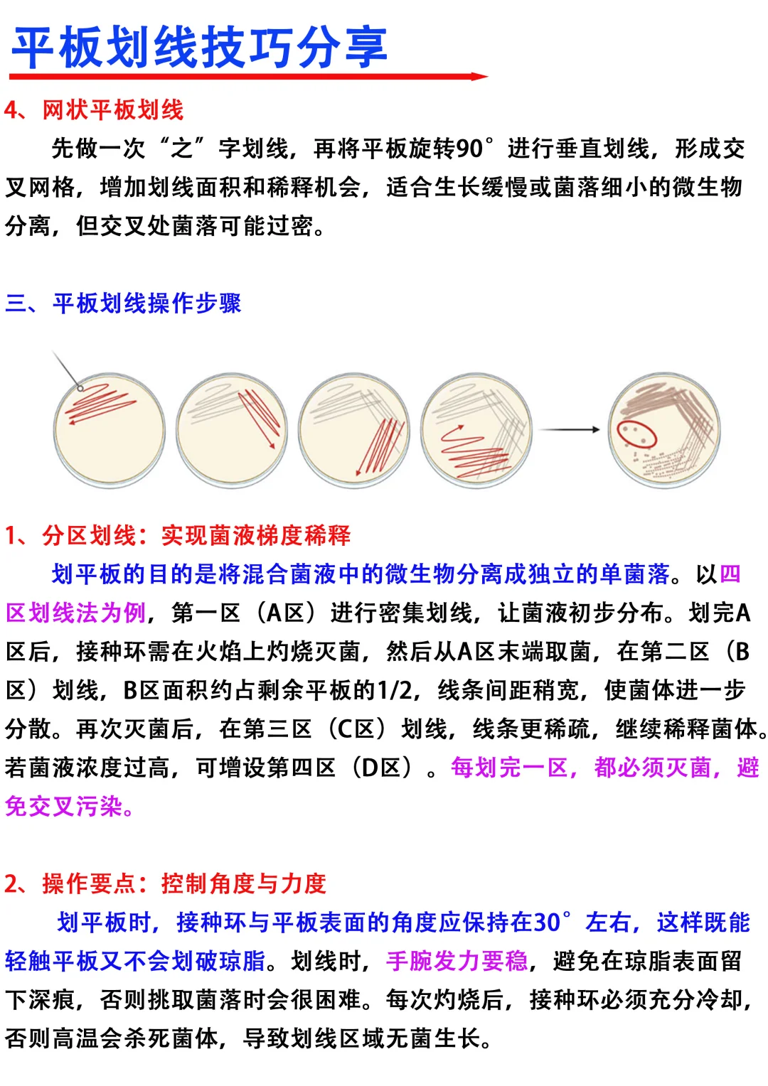 Hi~科研爱好者们,大家晚上好呀!我是科研废物,一名喜欢分享实验原理的科研博主 [萌萌哒R]谈起平板划线,大家真的学会了吗?本期就跟大家分享几个平板划线的小技巧 [向右R]接下来就从以下四个方面进行分享 1⃣️为什么要进行平板划线 2⃣️如何进行平板划线 3⃣️平板划线c作步骤 4⃣️常见问题及办法 满满的干货与tips,欢迎大家👍收藏,一起讨论交流呀