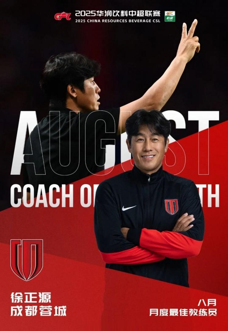直播吧9月25日讯日前,成都蓉城主帅徐正源当选中超联赛8月最佳教练。