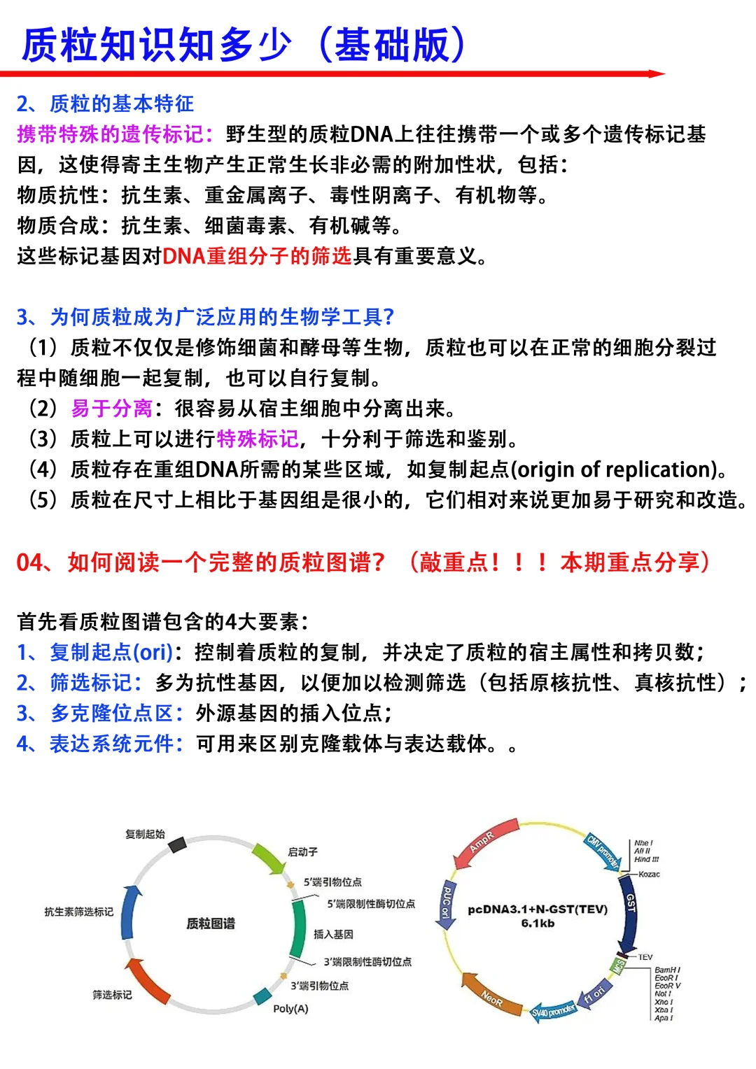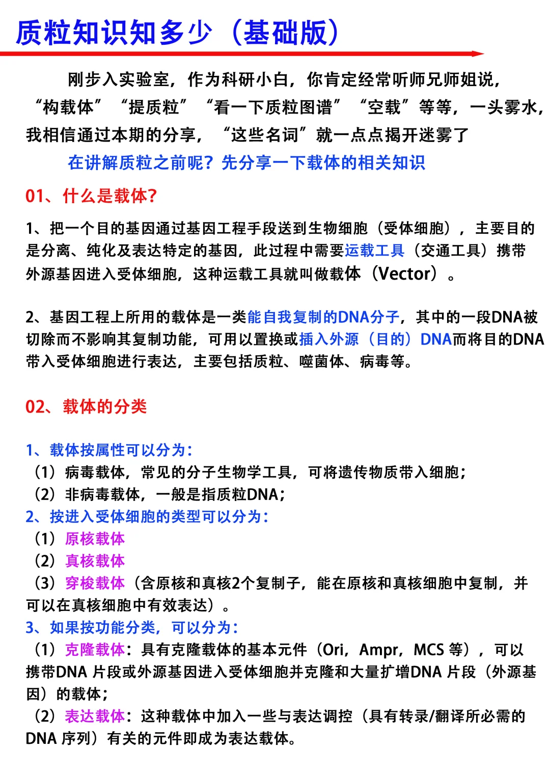 Hi~大家晚上好!我是科研废物[猪头R] 刚步入实验室,作为科研小白,你肯定经常听师兄师姐说,“构载体”“提质粒”“看一下质粒图谱”“空载”等等,一头雾水,[失望R]那么本期就跟大家分享一下质粒相关的科研干货 [向右R]主要从以下四个方面进行分享 1⃣️什么是载体 2⃣️载体的分类 3⃣️什么是质粒?具有哪些特征? 4⃣️如何阅读一个完整的质粒图谱(重点分享!) [彩虹R]满满的干货与tips ,我相信通过本期的分享,“这些名词”就一点点揭开迷雾了[派对R],欢迎大家讨论交流呀