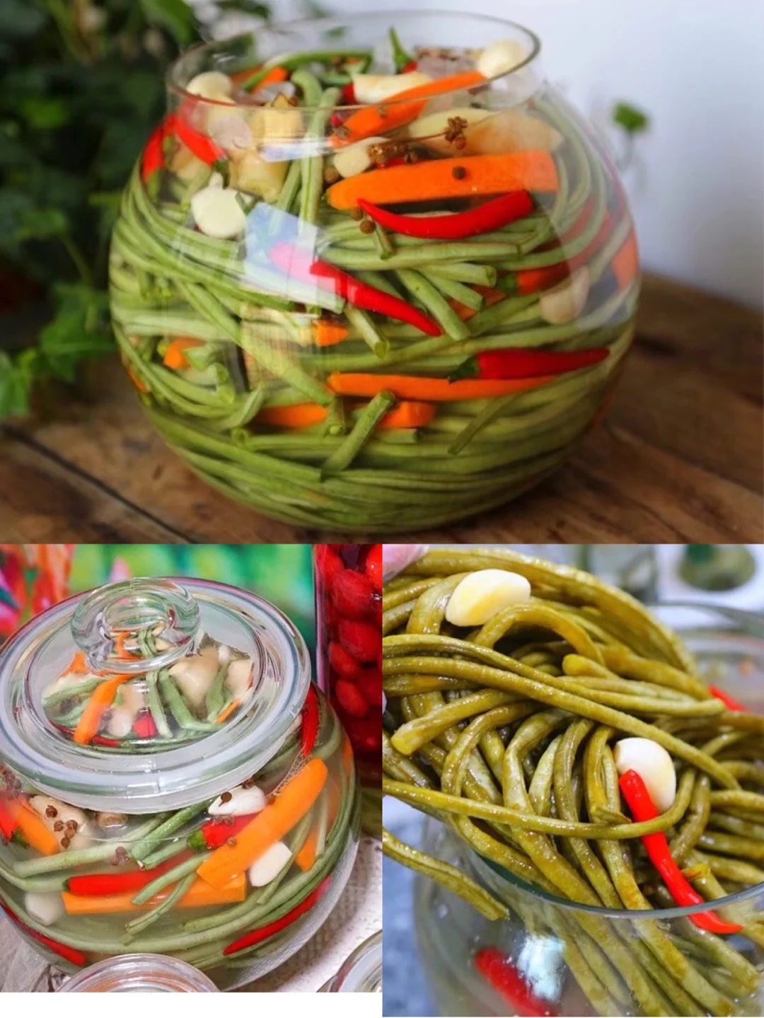 6.所有切好的弄好的材料一层一层的放进玻璃坛子里,特别豆角要一圈一圈的放