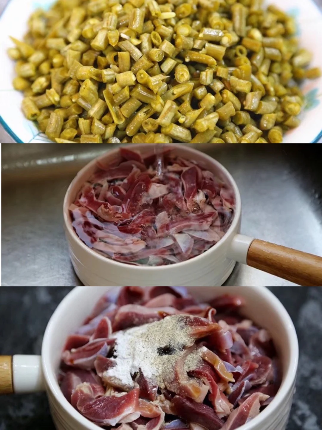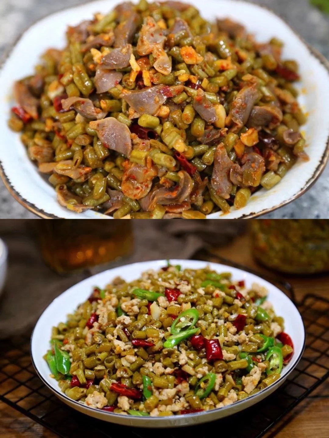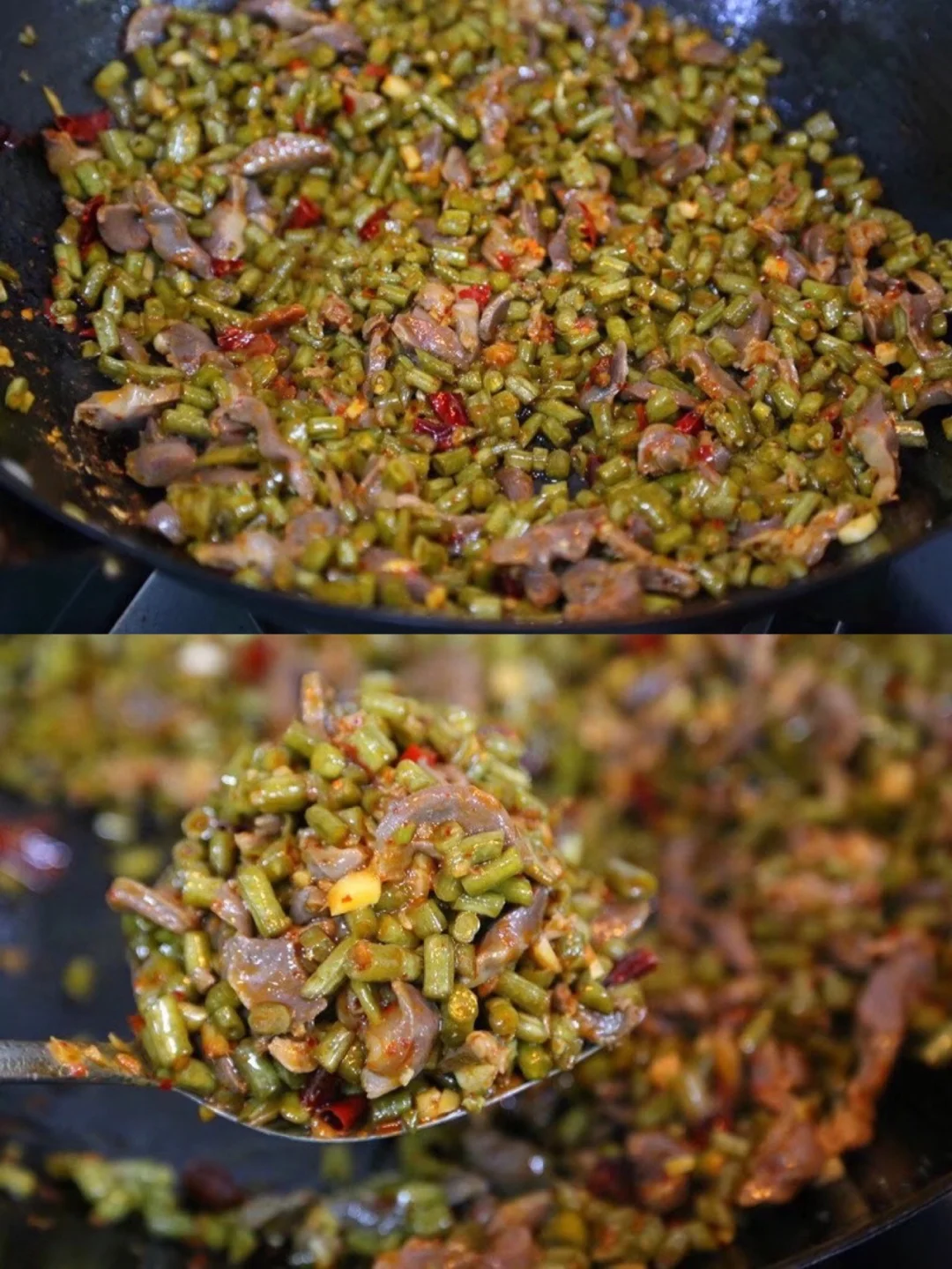 16.然后大蒜生姜末炒香加入豆角炒一会儿加入鸡胗 放少许白糖,辣椒粉,盐出锅即可