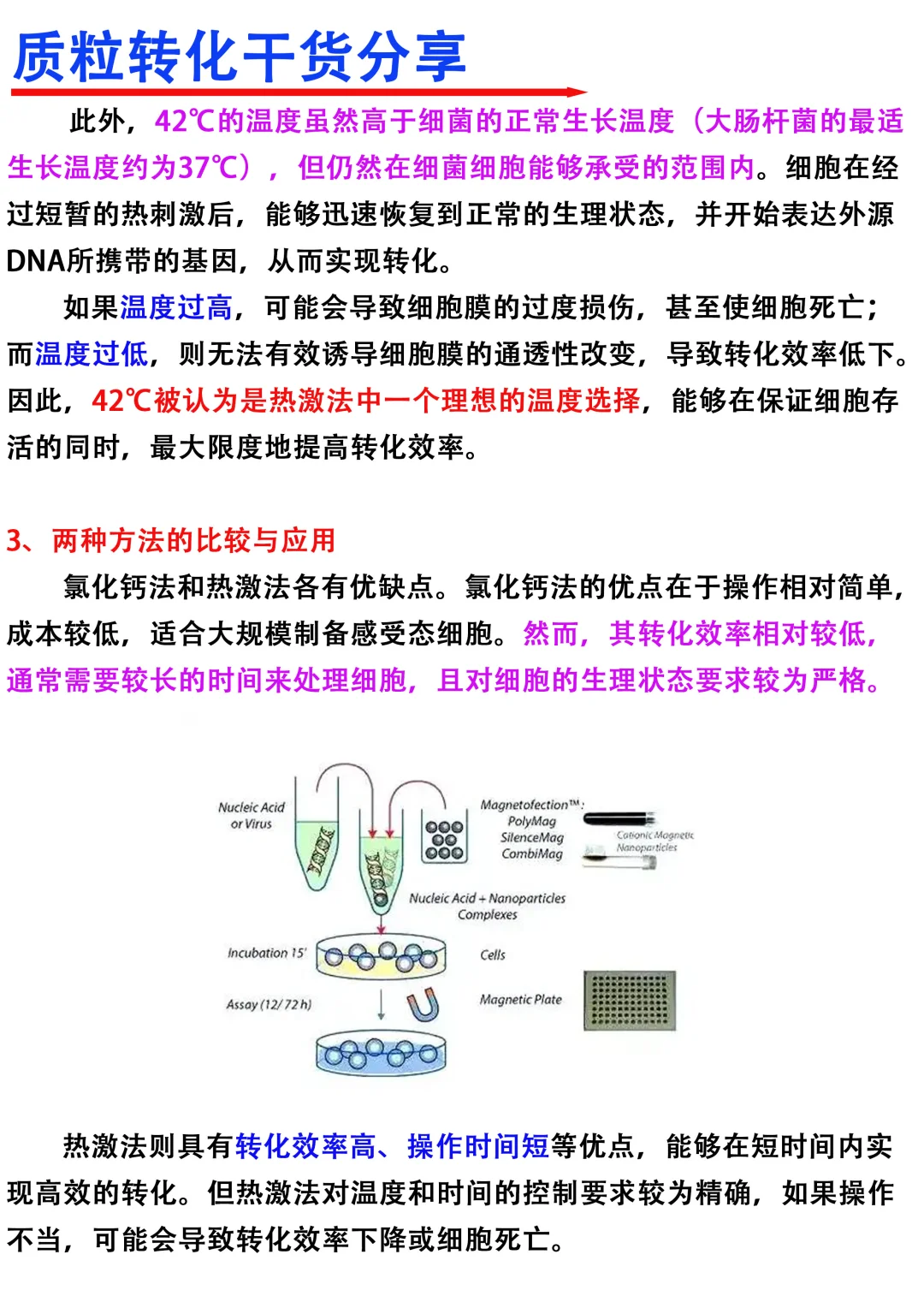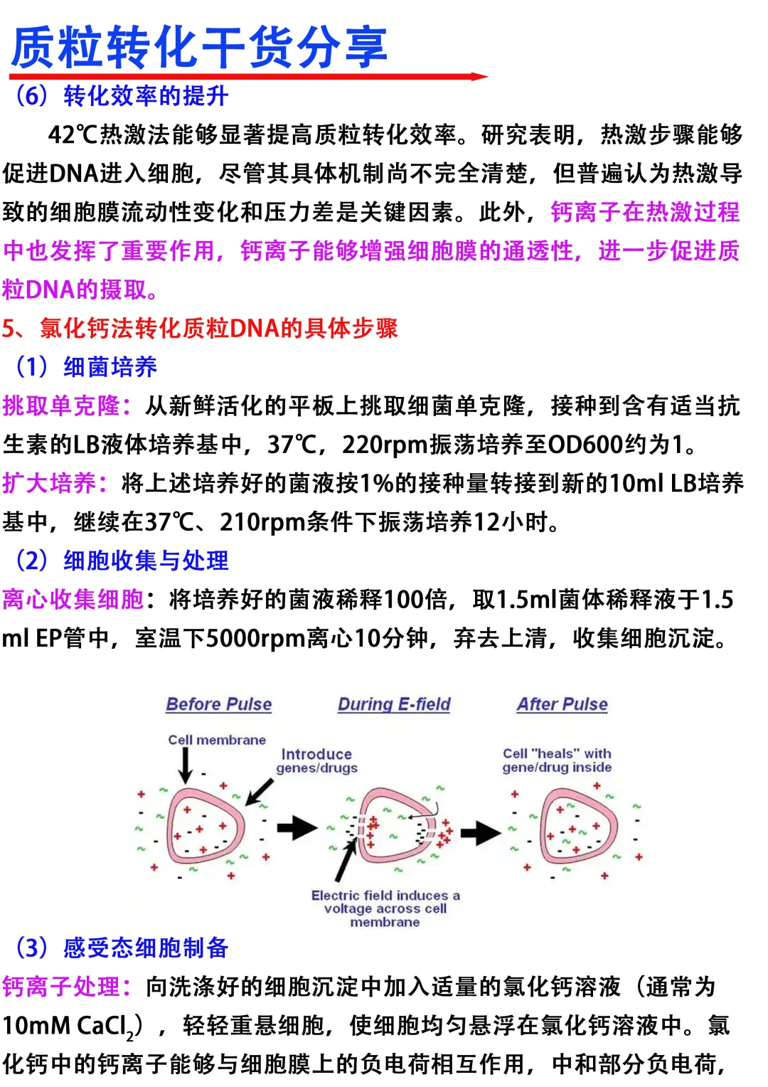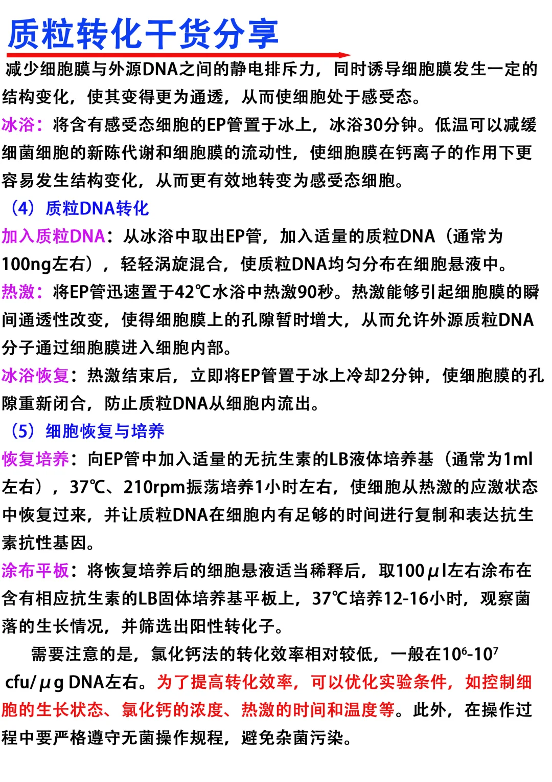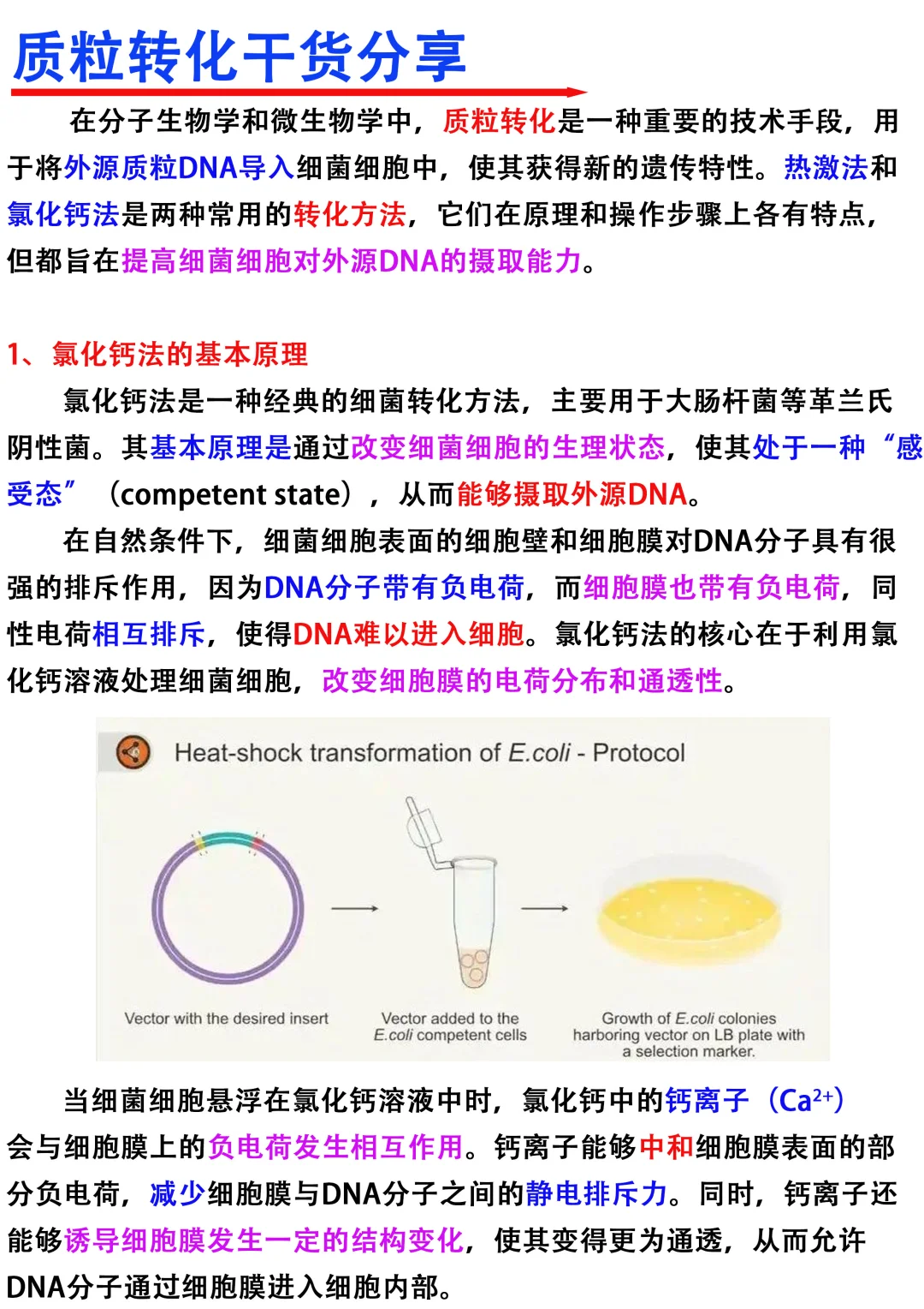 Hi~各位科研爱好者们,大家晚上好呀,我是科研废物,一名喜欢分享实验原理的科研博主 [萌萌哒R]说起质粒转化,大家真的学会了吗?本期就跟大家分享一下质粒转化相关的干货 [向右R]接下来从以下五个方面进行分享 1⃣️氯化钙法的基本原理 2⃣️热激法及其42度温度的解释 3⃣️两种方法的比较与应用 4⃣️42度热激法对细胞的影响 5️⃣氯化钙法转化质粒DNA的具体步骤 满满的干货与tips,欢迎大家👍收藏,一起讨论交流呀