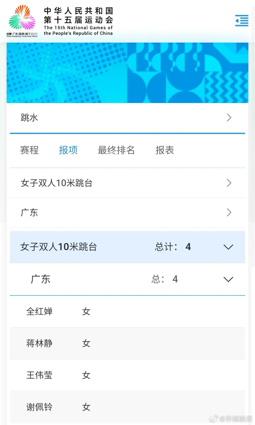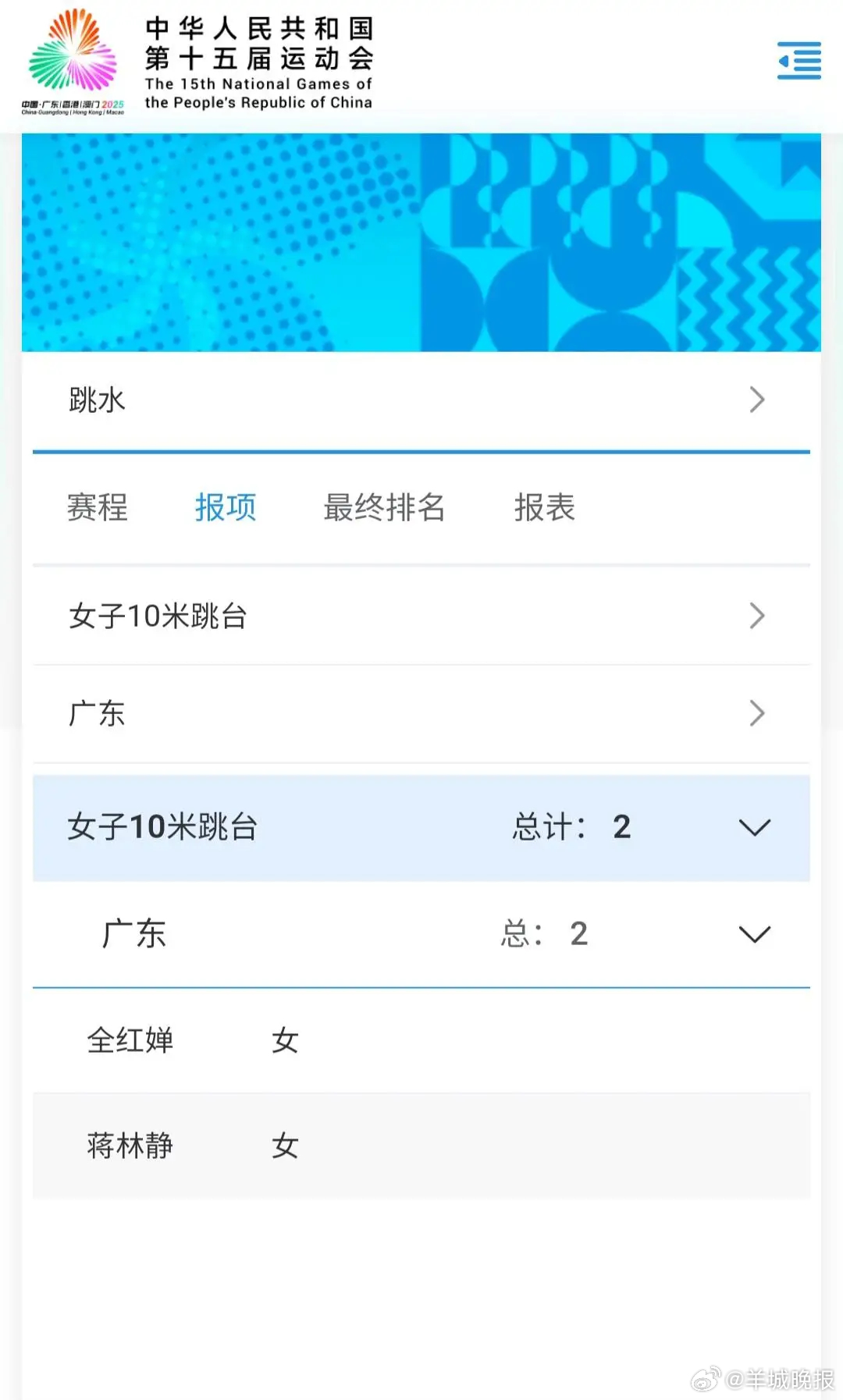 【#全红婵将在十五运重返赛场#】据第十五届全国运动会信息发布系统显示,已经5个月未参加正式比赛的两届奥运会跳水冠军出现在了十五运会广东省代表队跳水项目的名单中。系统显示,广东跳水队将参加十五运会跳水项目的全部14个小项,其中全红婵将出现在女子团体、女子双人10米台、女子10米台3个小项中。