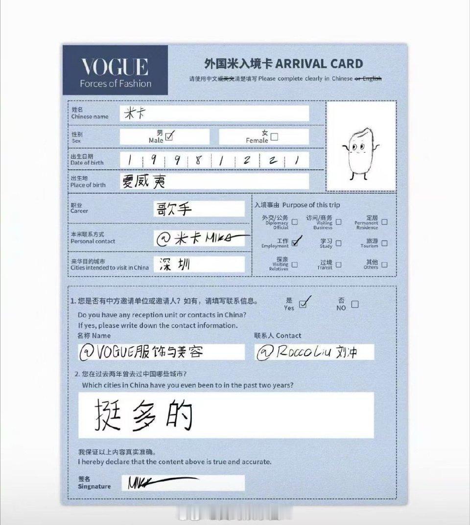 米卡我想开了就爆了 不愧是活动抽象赛道天赋型选手!VOGUE盛典官宣图里,白色马甲配小皮鞋加金色寸头,帅得亮眼,抽象感也丝毫不减。主题“我想开了”被他玩成爆米花梗,联动去年“外国米入境卡”,大米变爆米花,米卡的梗真的藏不住!