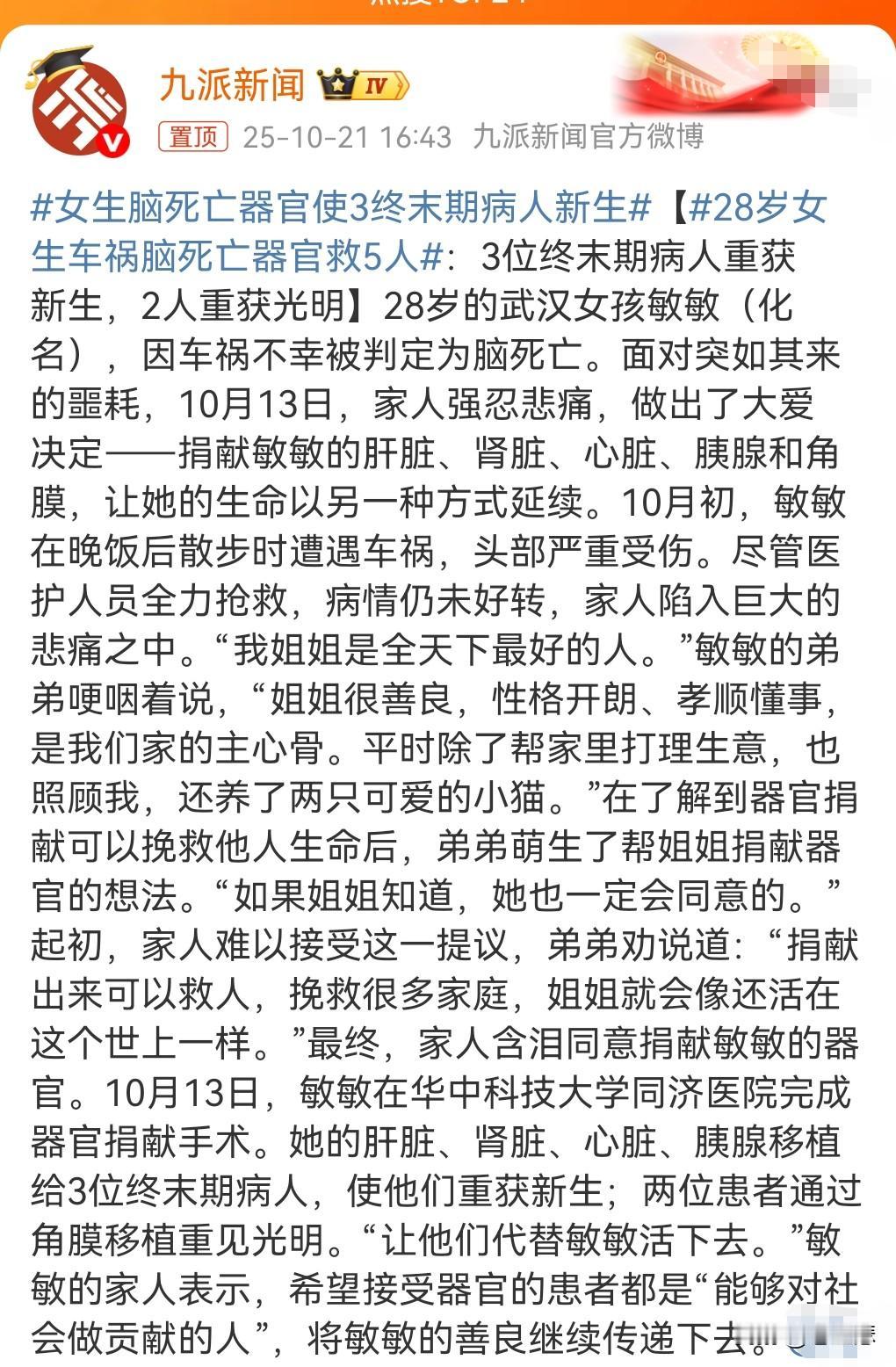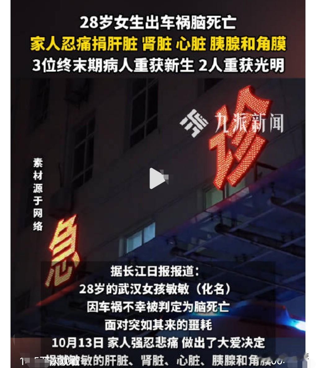 这真的是太可惜了。一个这么善良的人竟然出车祸出事了。 11月21日有媒体报道。 28岁女生车祸脑死亡器官救5人。 做出这个捐献器官是女子的弟弟决定的,开始的时候家人难以接受,后来他说把器官捐给别人,就好像姐姐还活着一样。 家人含泪同意捐献女子的器官。 可以看出弟弟的想法还是比较的开明了。