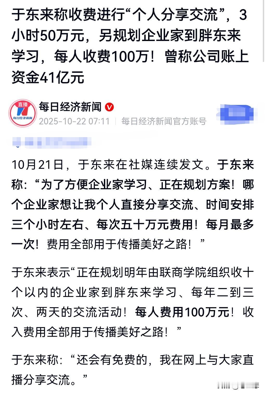 这真的是太疯狂了。 于东来“个人分享交流”收费50万元,这也太贵了吧。 他难道不知道这50万意味着有多贵吗? 真的能学到东西吗? 甚至有个项目还收100万。 这真的是太令人咋舌了。 听这些的成功学没什么意义。 学不到什么真东西。