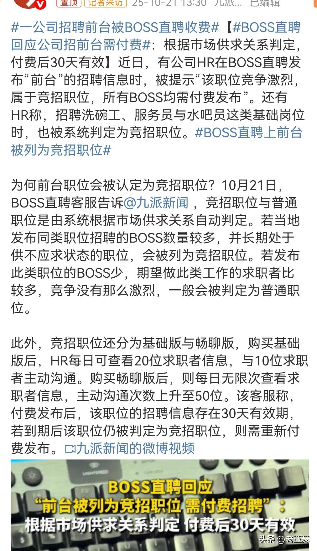 这确实让人难以接受。 免费的东西用久了,没想到突然之间要收费,的确实让人不愿意出这个钱。 近日报道。 一公司招聘前台被BOSS直聘收费,想不到招个前台,招聘方要向boss直聘付费才能发布。 这很离谱啊。 前台又不是什么好工作。 这么卷的吗? 原来这是被认定为是热门职业,所以需要付费才能发布。 值得一提的是,Boss直聘里面,像什么洗碗、服务员也是热门职业,也要付费才能发布。