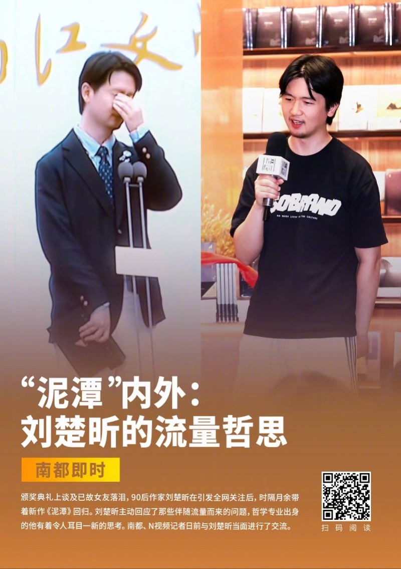 今年7月,在《泥潭》新书发布会上,南都记者曾与爆红之后的刘楚昕当面交流。他自认为不是“拥有顶级天赋的作家”,从十三四岁萌生作家梦,之后的十几年一直在写,投稿多次被拒也没有放弃。意外获得全网关注之后,刘楚昕自嘲是“流量作家”,出圈的过程是意料之外的,但结果是好的,“我写的这个故事、我创造的这个世界,终于有人注意到了。”