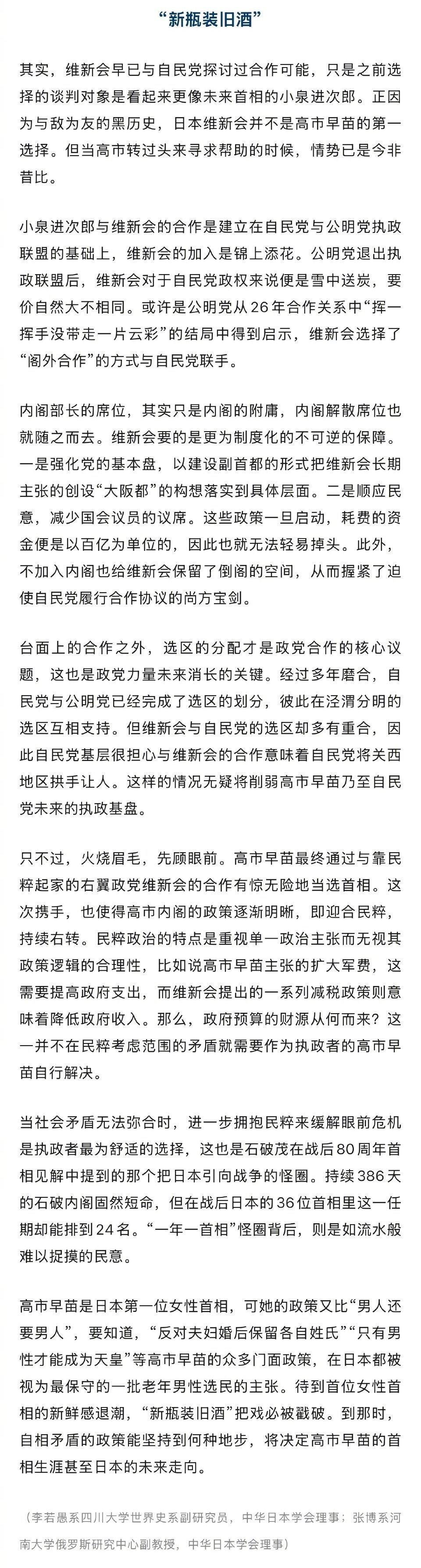 高市早苗其政策与小泉类似,有些是必须考虑党派合作做一些妥协让步! 她的执政根基是脆弱的,因此她的政策会比竞选承诺要软化许多,不然她就可能成为一个走马灯首相的一员! 听其言观其行吧?! 日本首位女首相的政策比男人还男人【高市早苗会是下一位短命首相吗】 日本首位女首相的政策比男人还男人 随着10月21日石破茂按程序率领内阁总辞职,石破政权在走过了386天后落下了帷幕。当天下午,高市早苗在日本国会当选历史上第一位女性首相。 与一年多前在众议院第一轮投票中未达到半数,需要在第二轮选举中依靠简单多数才能获胜的石破茂不同,高市早苗依靠新的执政伙伴、右翼政党日本维新会的支持,在众议院第一轮投票中就拿下超过半数的237票,顺利胜出。 不过,高市早苗的首相之路其实走得跌宕起伏。 高市早苗是日本第一位女性首相,可她的政策又比“男人还要男人”,要知道,“反对夫妇婚后保留各自姓氏”“只有男性才能成为天皇”等高市早苗的众多门面政策,在日本都被视为最保守的一批老年男性选民的主张。待到首位女性首相的新鲜感退潮,“新瓶装旧酒”把戏必被戳破。到那时,自相矛盾的政策能坚持到何种地步,将决定高市早苗的首相生涯甚至日本的未来走向。